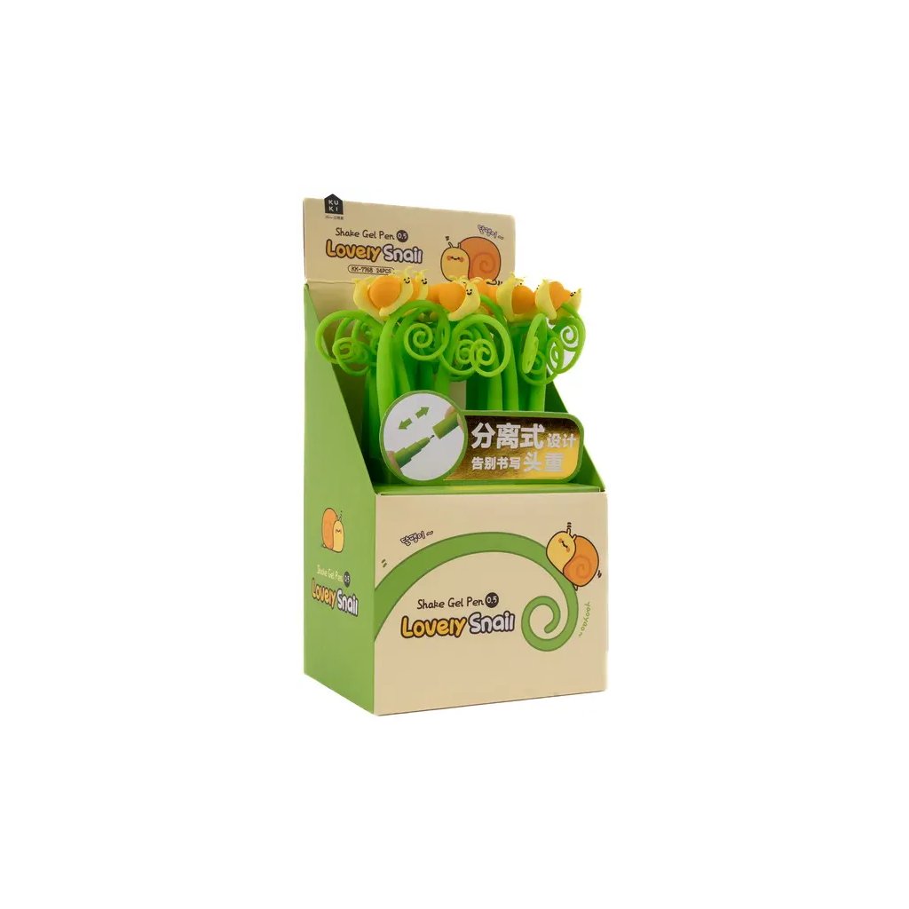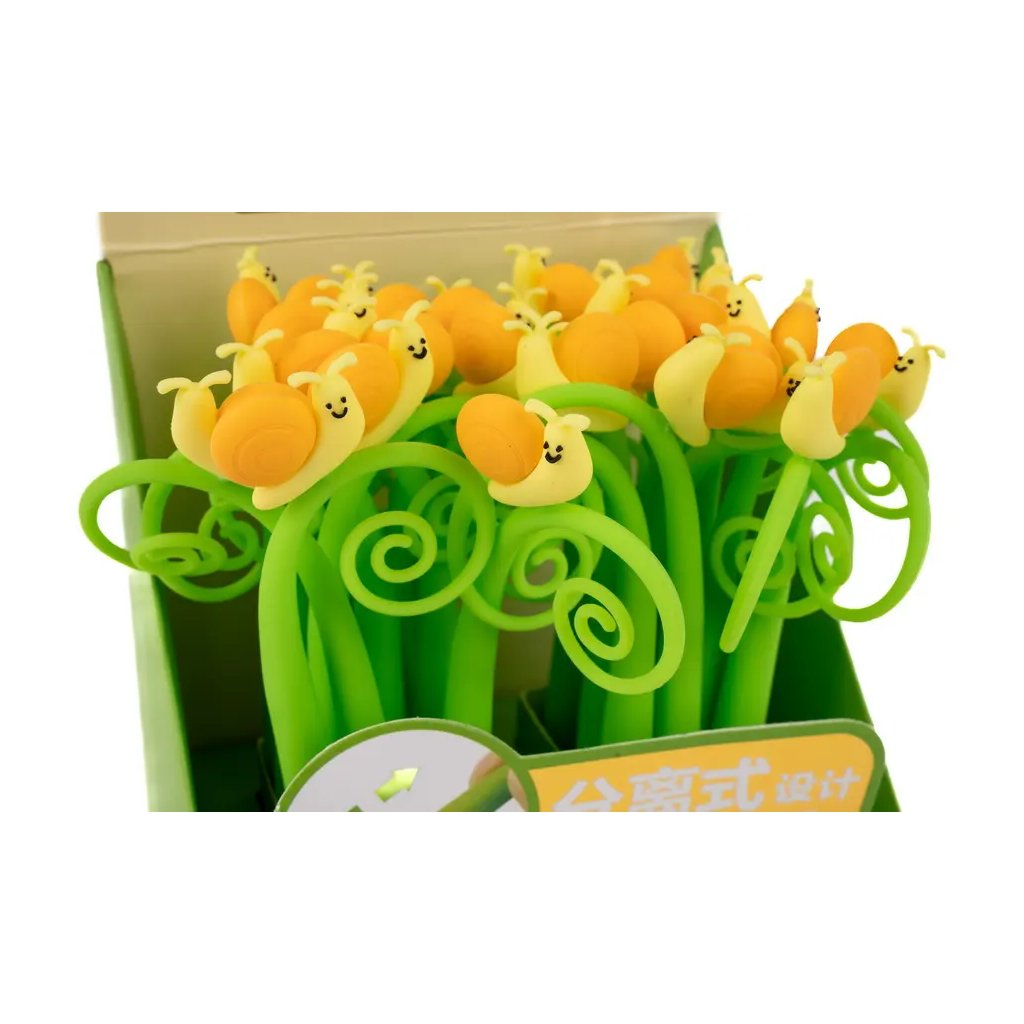 Jedná se o silikonové gelové pero Silky Lovely snail s tělem z pružného materiálu a motivem roztomilého šnečka na jeho konci. Pero s víčkem píše modrým inkoustem o šířce stopy 0,5 mm a má vyměnitelnou náplň F-Expert/Techjob Office. Je v různých barevných kombinacích, ideální pro školáky, studenty i jako veselý doplněk do kanceláře. Pokud vám záleží na konkrétním designu, specifikujte jej v poznámkách objednávky.Doplňkové parametry
