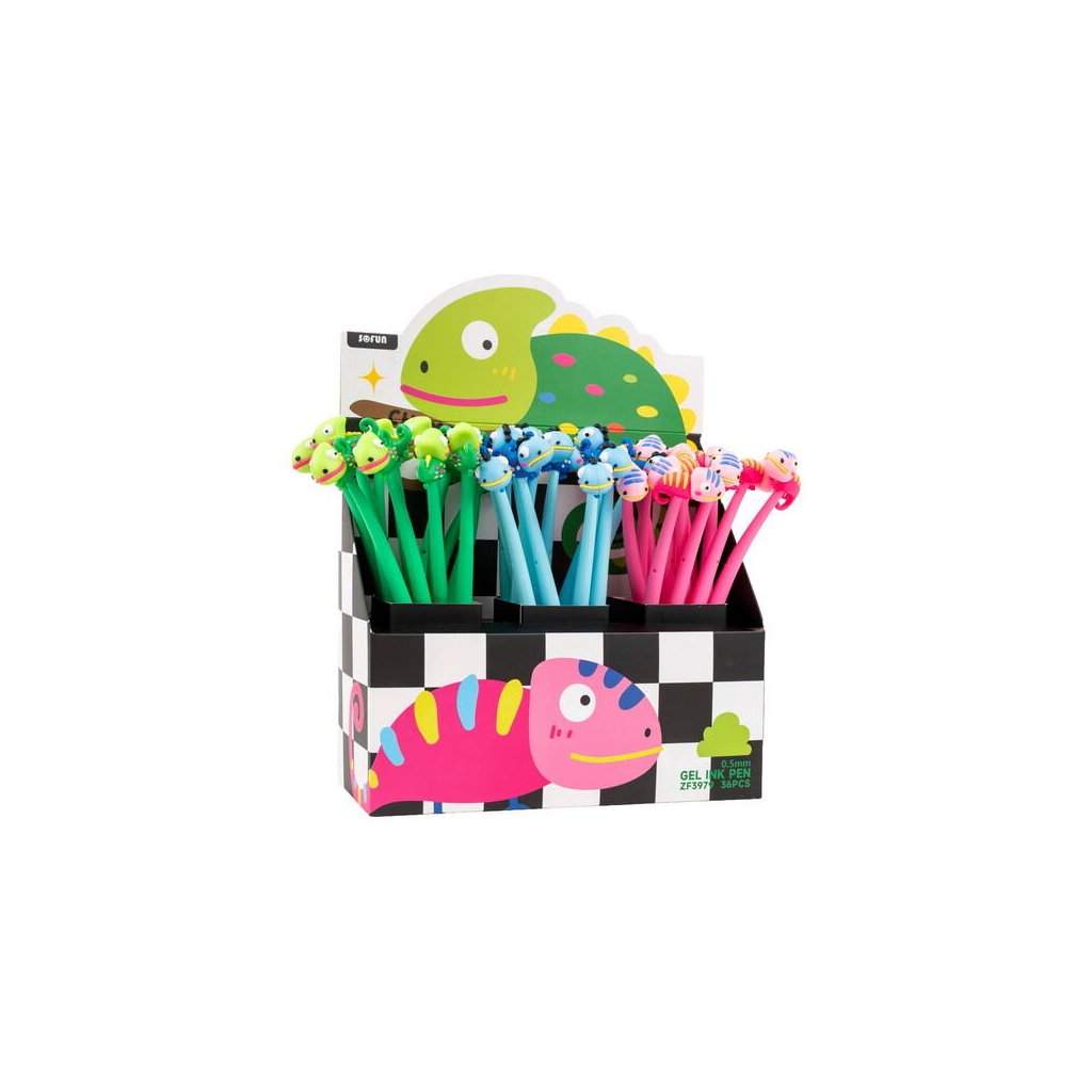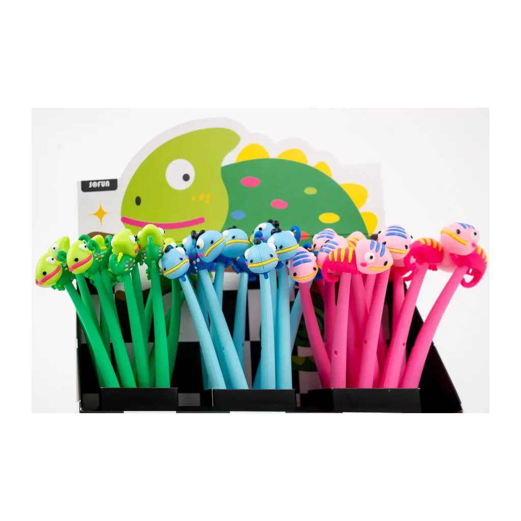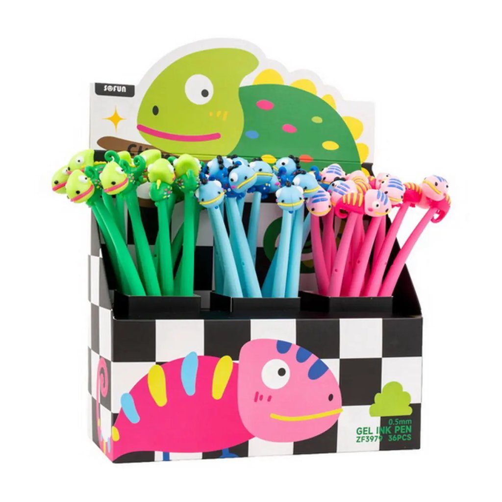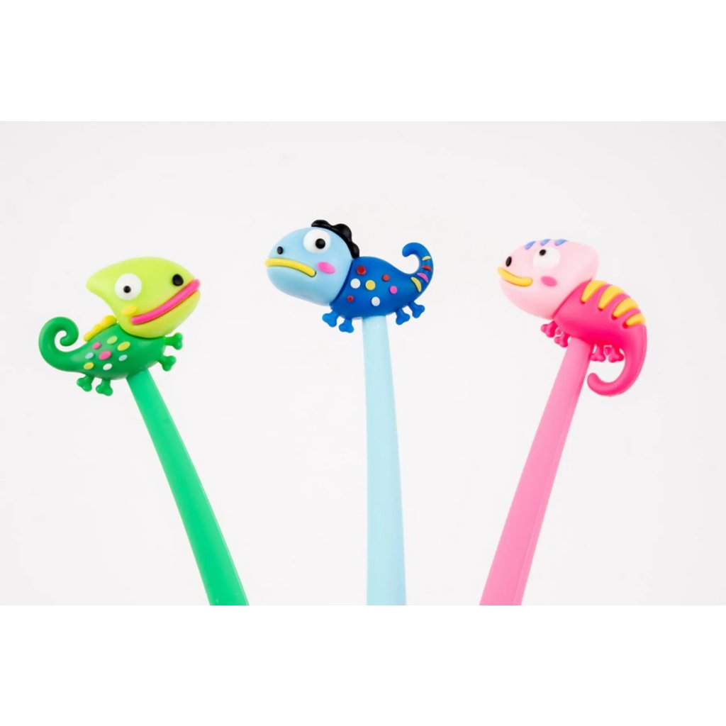 Jedná se o gelové pero s roztomilým a hravým designem s motivem chameleona. Pero je vyrobeno z pružného silikonového materiálu a má víčko. Je vybaveno kvalitní vyměnitelnou náplní typu F-Expert/Techjob Office. Píše modrým inkoustem s jemnou šíří stopy 0,5 mm. Cena je uvedena za 1 kus. Pero je dodáváno v balení jako mix vzorů a barev (např. zelená, modrá, růžová). Pokud vám záleží na konkrétním motivu (barvě), specifikujte jej v poznámce objednávky.Doplňkové parametry