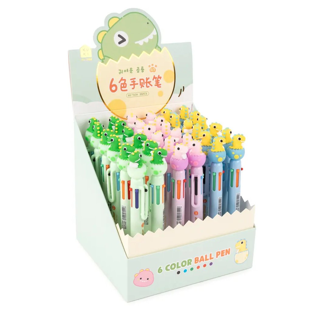 Jedná se o plastové šestibarevné kuličkové pero, které se ovládá stiskacím mechanismem. Pero má na sobě ozdobu ve tvaru malého dinosaura, který vylézá z vajíčka. Šíře stopy je 0,7 mm a barvy náplní jsou: červená, modrá, zelená, černá, oranžová a fialová. Díky šesti barvám je ideální na psaní, kreslení, zvýrazňování textu nebo na organizaci poznámek. Pokud vám záleží na konkrétní barevné variantě pera, specifikujte to v poznámce objednávky.Doplňkové parametry