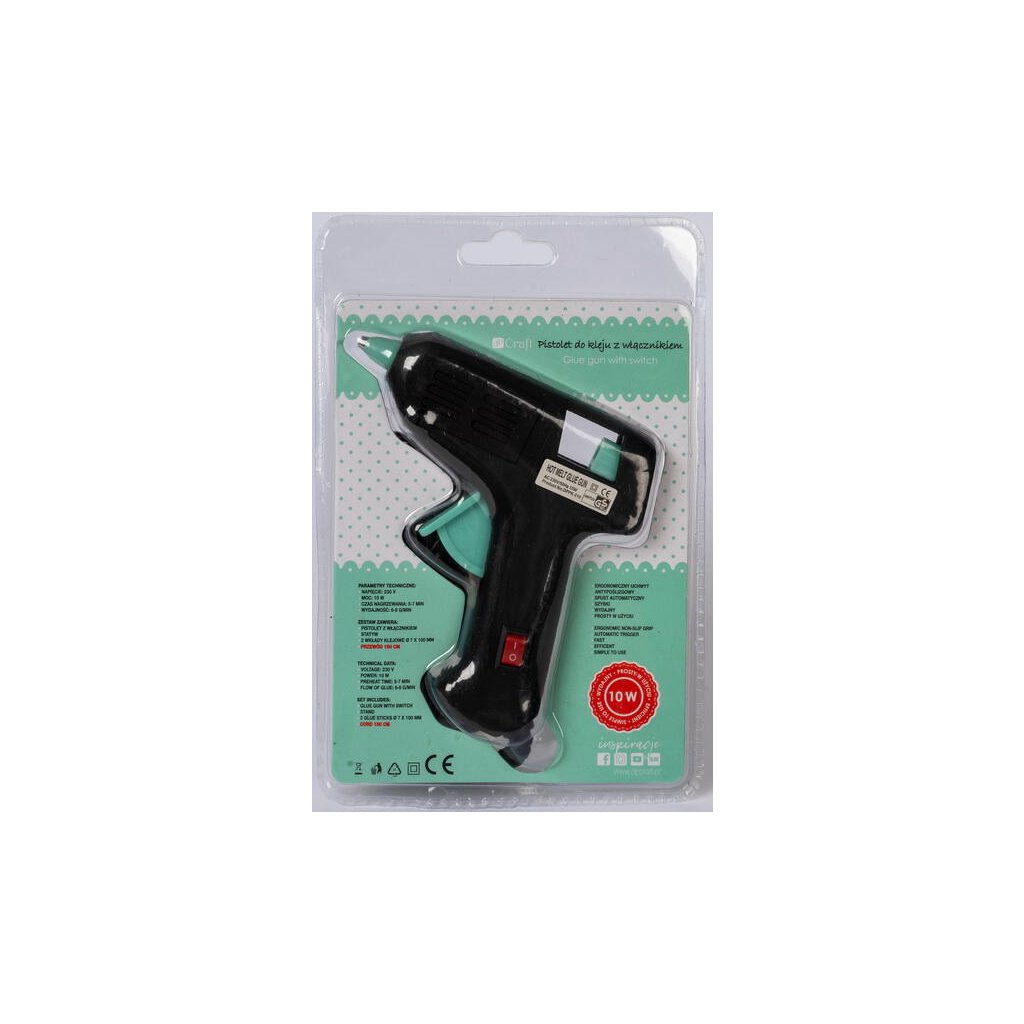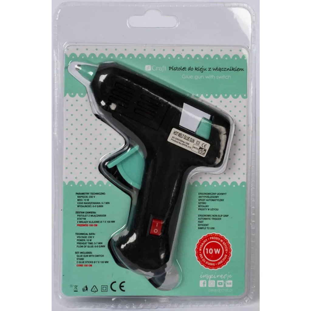 Jedná se o praktickou menší tavnou pistoli s vypínačem a výkonem 10 W. Je vhodná pro drobné opravy, ruční práce, kutilství a dekorace. Pistole lepí k sobě různé druhy materiálů, jako jsou plast, keramika, kůže, textil, nebo dekor dřeva. V balení naleznete také dvě lepicí tyčinky o průměru 7 mm a délce 10 cm.Doplňkové parametry