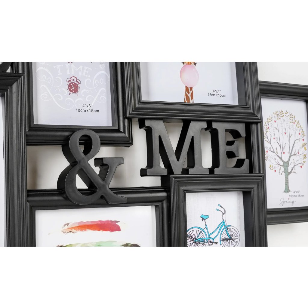 Vzpomínejte na své nejkrásnější okamžiky s tímto originálním plastovým fotorámečkem Gallery v černém provedení. Rámeček má tvar koláže, jejíž dominantu tvoří nápis YOU & ME. Rámeček je určen na celkem 6 fotografií – 4 fotografie o rozměrech 10 x 15 cm, 1 fotografii o rozměrech 10 x 10 cm a 1 fotografii o rozměrech 13 x 18 cm. Celý rámeček má rozměr 57 x 36 cm a je určen k zavěšení na zeď. Fotografie se vkládají jednoduše ze zadní strany a jsou chráněny plexisklem.Doplňkové parametry