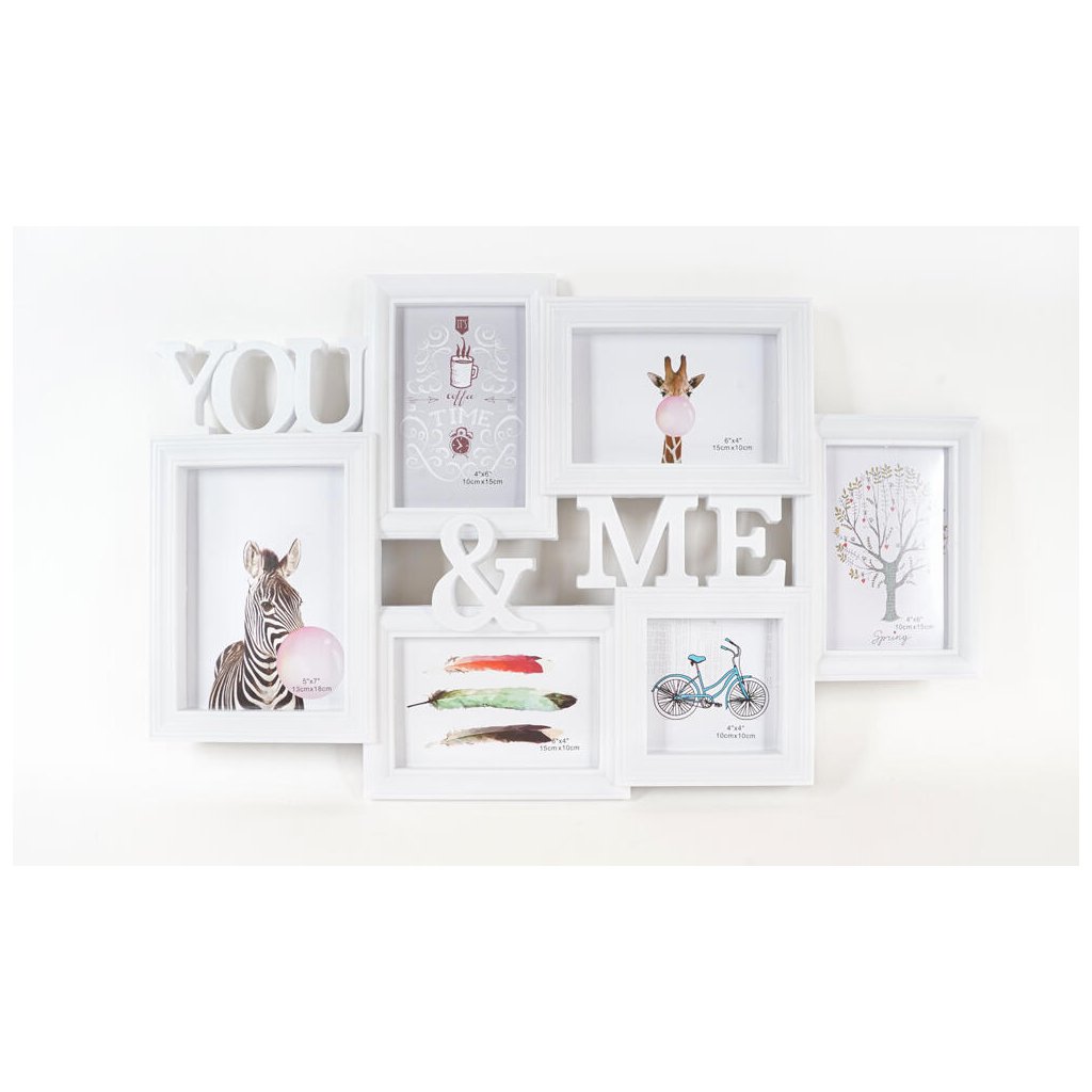 Vzpomínejte na své nejkrásnější okamžiky s tímto originálním plastovým fotorámečkem Gallery v bílém provedení. Rámeček má tvar koláže, jejíž dominantu tvoří nápis YOU & ME. Rámeček je určen na celkem 6 fotografií – 4 fotografie o rozměrech 10 x 15 cm, 1 fotografii o rozměrech 10 x 10 cm a 1 fotografii o rozměrech 13 x 18 cm. Celý rámeček má rozměr 57 x 36 cm a je určen k zavěšení na zeď. Fotografie se vkládají jednoduše ze zadní strany a jsou chráněny plexisklem.Doplňkové parametry