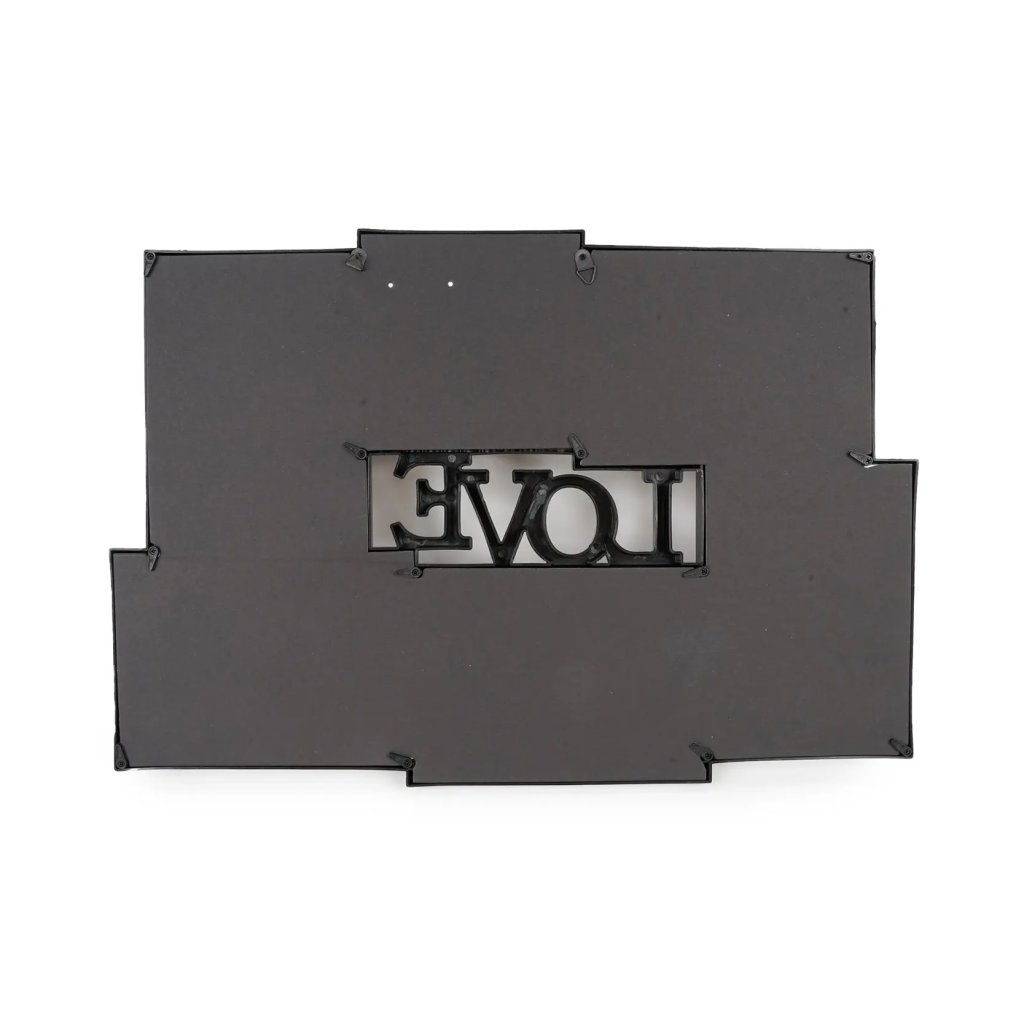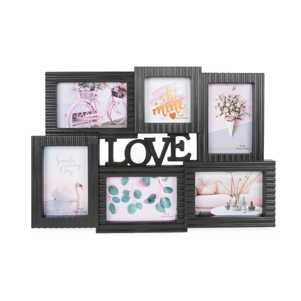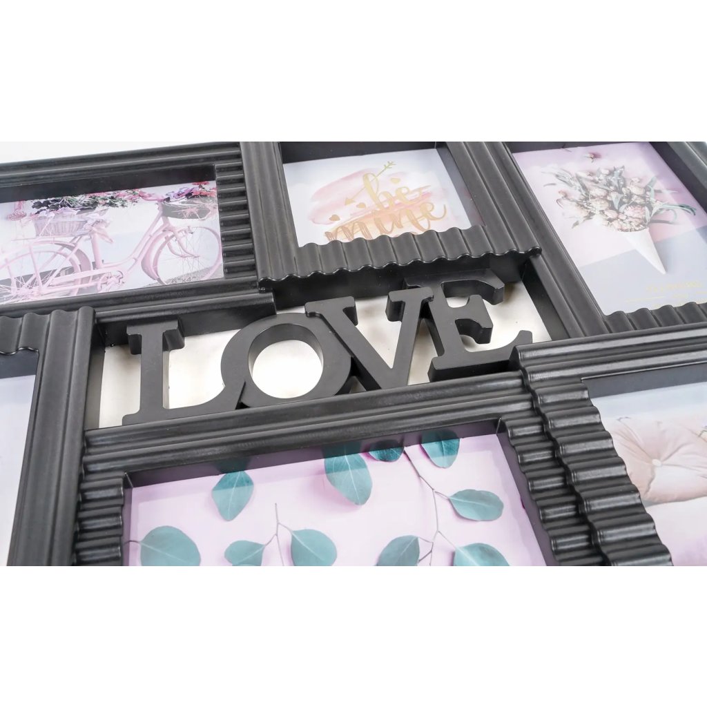 Vzpomínejte na své nejkrásnější okamžiky s tímto originálním plastovým fotorámečkem Gallery v černém provedení. Rámeček má tvar koláže, jejíž dominantu tvoří nápis LOVE. Rámečky jsou ozdobeny jemným vodorovným vroubkováním. Rámeček je určen na celkem 6 fotografií – 5 fotografií o rozměrech 10 x 15 cm a 1 fotografii o rozměrech 10 x 10 cm. Celý rámeček má rozměr 49 x 34 cm a je určen k zavěšení na zeď. Fotografie se vkládají jednoduše ze zadní strany a jsou chráněny plexisklém.Doplňkové parametry