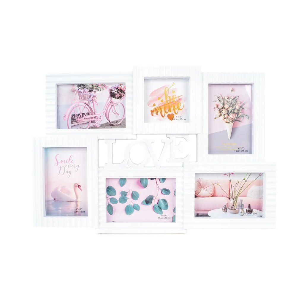 Vzpomínejte na své nejkrásnější okamžiky s tímto originálním plastovým fotorámečkem Gallery v bílém provedení. Rámeček má tvar koláže, jejíž dominantu tvoří nápis LOVE. Rámečky jsou ozdobeny jemným vodorovným vroubkováním. Rámeček je určen na celkem 6 fotografií – 5 fotografií o rozměrech 10 x 15 cm a 1 fotografii o rozměrech 10 x 10 cm. Celý rámeček má rozměr 49 x 34 cm a je určen k zavěšení na zeď. Fotografie se vkládají jednoduše ze zadní strany a jsou chráněny plexisklém.Doplňkové parametry