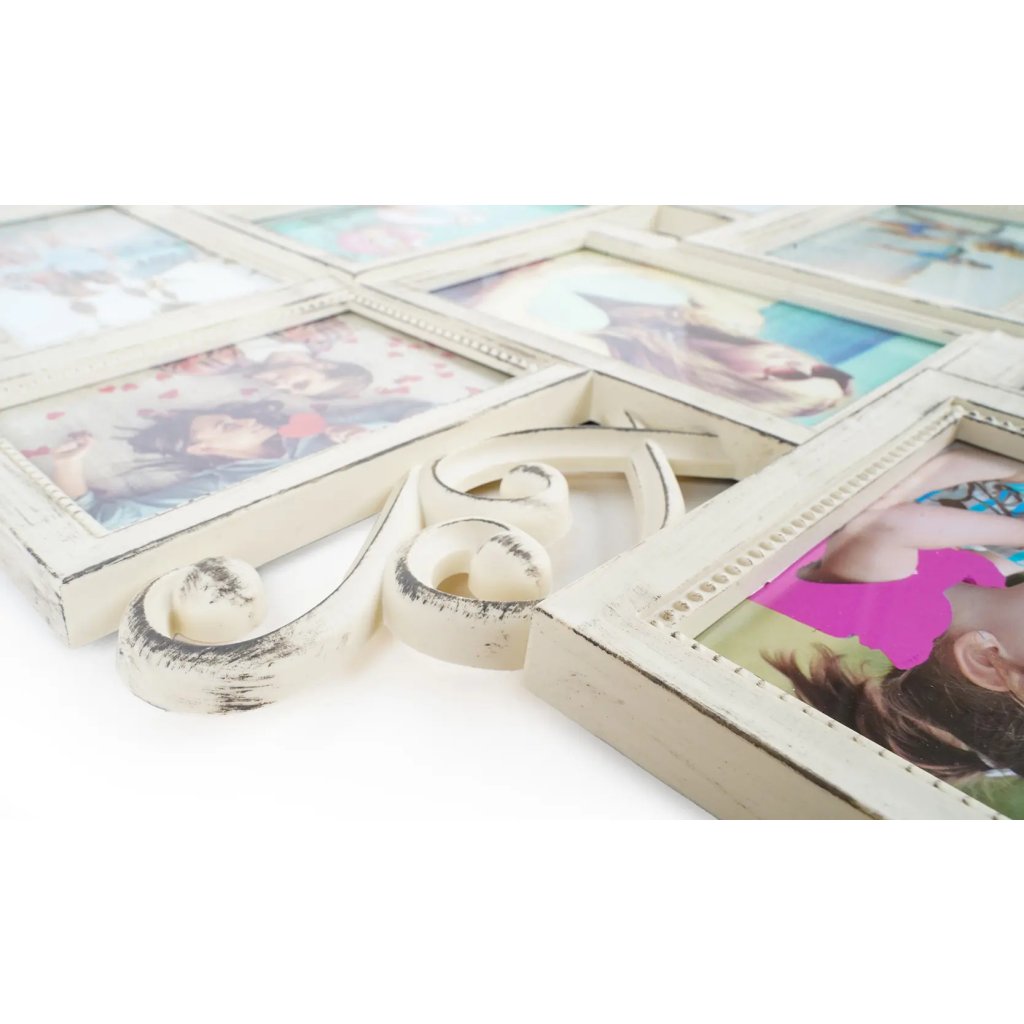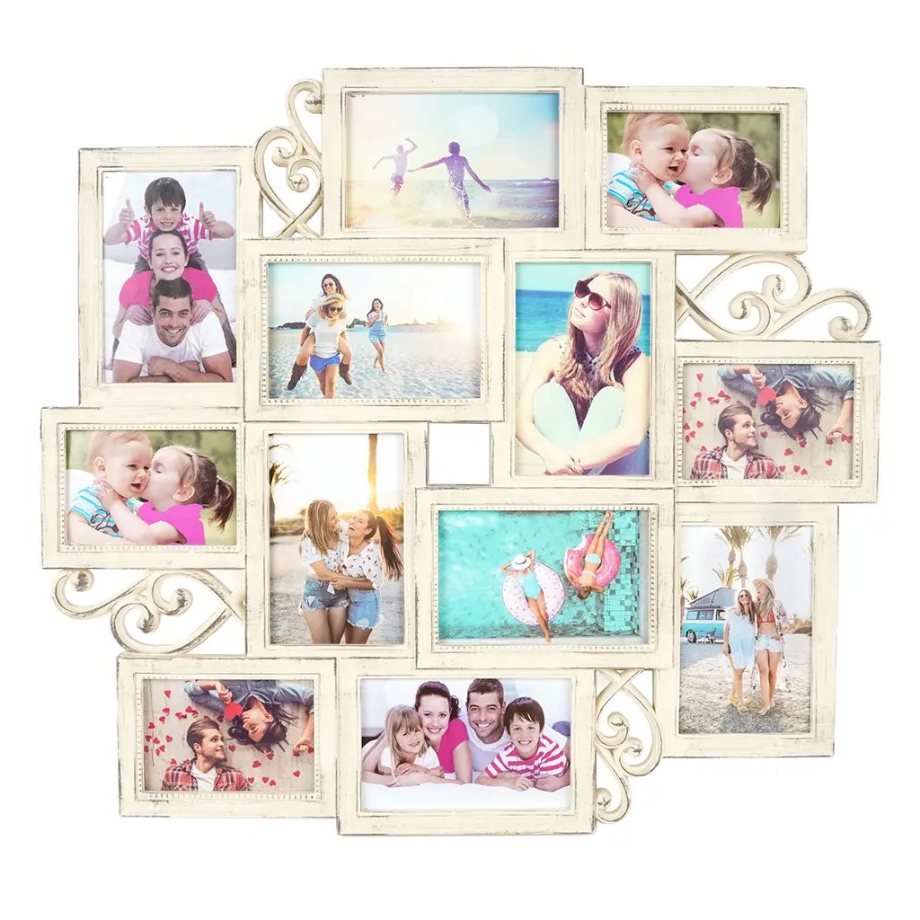 Vzpomínejte na své nejkrásnější okamžiky s tímto originálním plastovým fotorámečkem Gallery v béžovém provedení s patinou. Rámeček má tvar koláže rámečků, které jsou propojené ozdobnými plastickými ornamenty. Rámeček je určen na celkem 12 fotografií – 8 fotografií o rozměrech 10 x 15 cm a 4 fotografie o rozměrech 9 x 13 cm. Celý rámeček má rozměr 55 x 50,5 cm a je určen k zavěšení na zeď. Fotografie se vkládají jednoduše ze zadní strany a jsou chráněny plexisklem.Doplňkové parametry