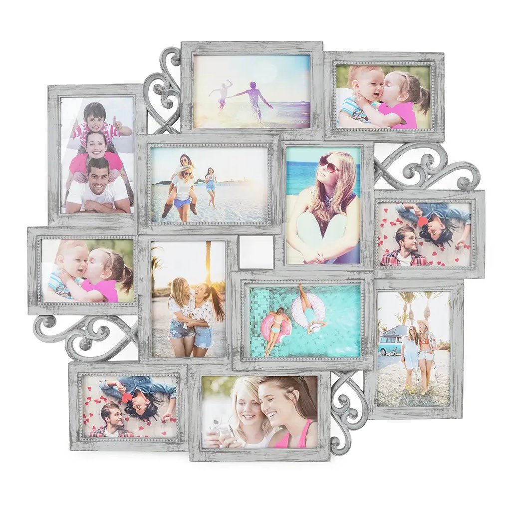 Vzpomínejte na své nejkrásnější okamžiky s tímto originálním plastovým fotorámečkem Gallery v šedém provedení s patinou. Rámeček má tvar koláže rámečků, které jsou propojené ozdobnými plastickými ornamenty. Rámeček je určen na celkem 12 fotografií – 8 fotografií o rozměrech 10 x 15 cm a 4 fotografie o rozměrech 9 x 13 cm. Celý rámeček má rozměr 55 x 50,5 cm a je určen k zavěšení na zeď. Fotografie se vkládají jednoduše ze zadní strany a jsou chráněny plexisklem.Doplňkové parametry