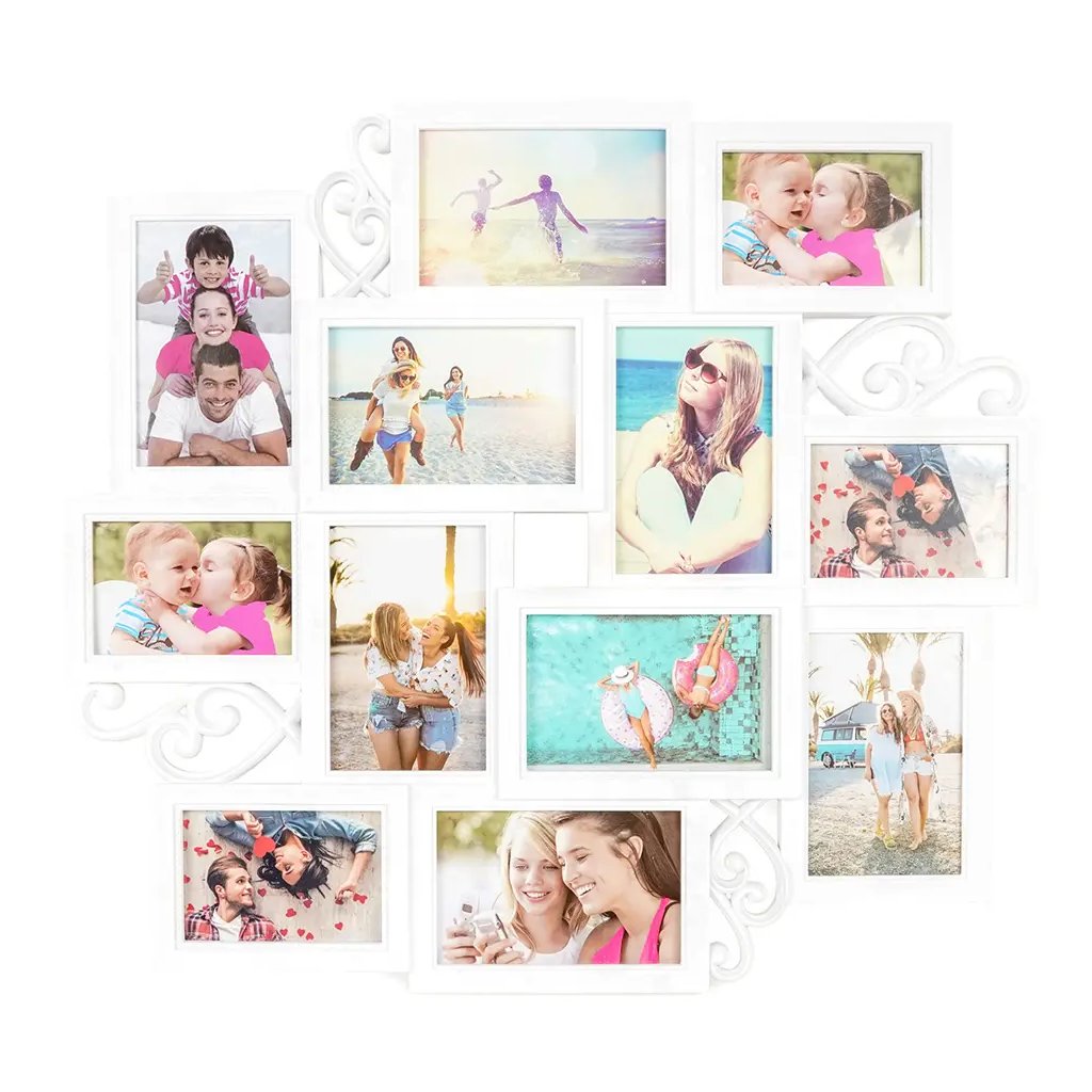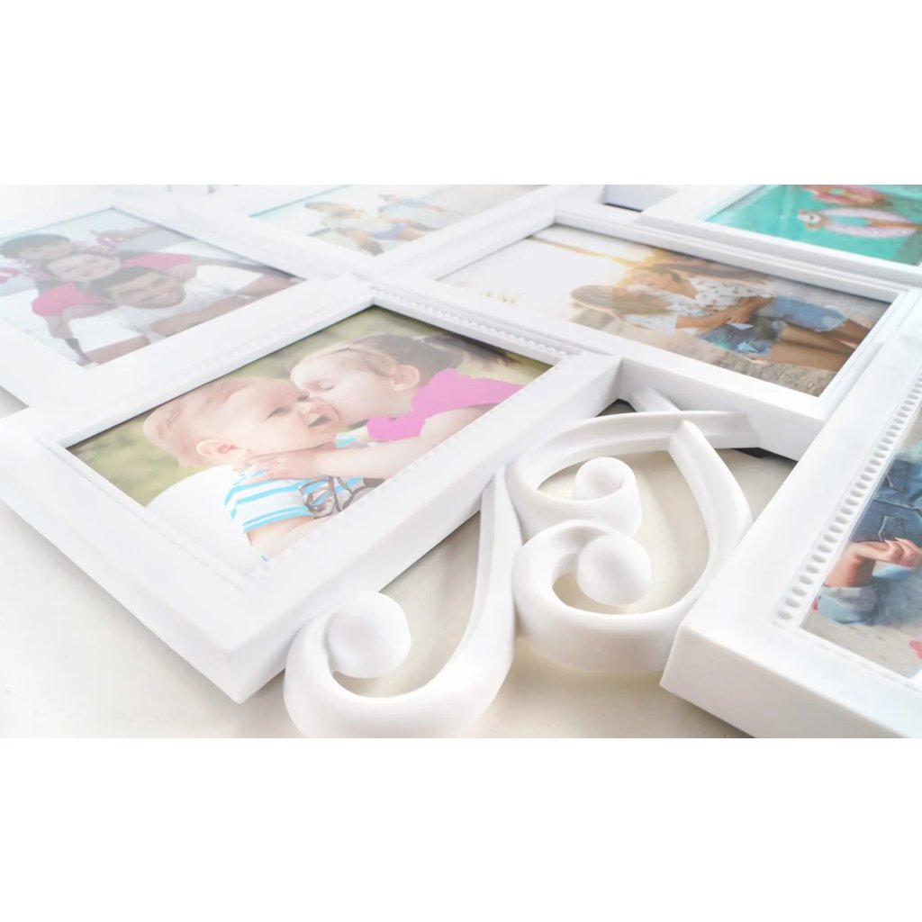 Vzpomínejte na své nejkrásnější okamžiky s tímto originálním plastovým fotorámečkem Gallery v bílémprovedení. Rámeček má tvar koláže rámečků, které jsou propojené ozdobnými plastickými ornamenty. Rámeček je určen na celkem 12 fotografií – 8 fotografií o rozměrech 10 x 15 cm a 4 fotografie o rozměrech 9 x 13 cm. Celý rámeček má rozměr 55 x 50,5 cm a je určen k zavěšení na zeď. Fotografie se vkládají jednoduše ze zadní strany a jsou chráněny plexisklem.Doplňkové parametry