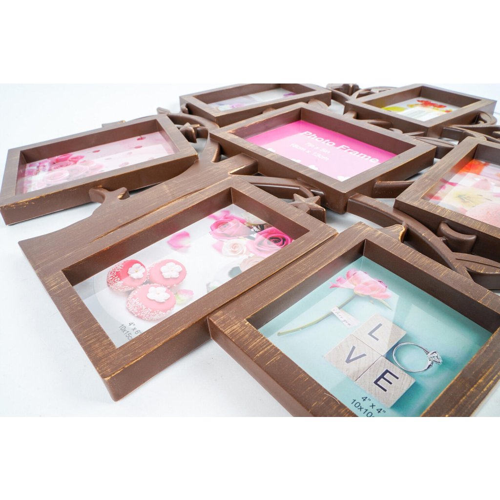 Vzpomínejte na své nejkrásnější okamžiky s tímto originálním plastovým fotorámečkem Gallery v hnědém provedení s patinou. Rámeček má tvar stromu, v jehož větvích jsou umístěny rámečky na fotografie. Celek tak působí jako rodokmen. Rámeček je určen na celkem 7 fotografií – 4 fotografie o rozměrech 10 x 15 cm, 2 fotografie o rozměrech 13 x 18 cm a 1 fotografii o rozměrech 10 x 10 cm. Celý rámeček má rozměr 53,5 x 45 cm a je určen k zavěšení na zeď. Fotografie se vkládají jednoduše ze zadní strany a jsou chráněny plexisklem.Doplňkové parametry