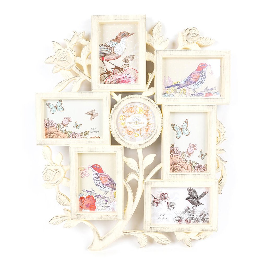 Vzpomínejte na své nejkrásnější okamžiky s tímto originálním plastovým fotorámečkem Gallery v béžovém provedení s patinou. Rámeček má tvar koláže rámečků, které jsou propojeny plastickými větvičkami a květy. Rámeček je určen na celkem 7 fotografií – 6 fotografií o rozměrech 10 x 15 cm a 1 fotografii o průměru 10 cm. Celý rámeček má rozměr 44 x 54 cm a je určen k zavěšení na zeď. Fotografie se vkládají jednoduše ze zadní strany a jsou chráněny plexisklem.Doplňkové parametry