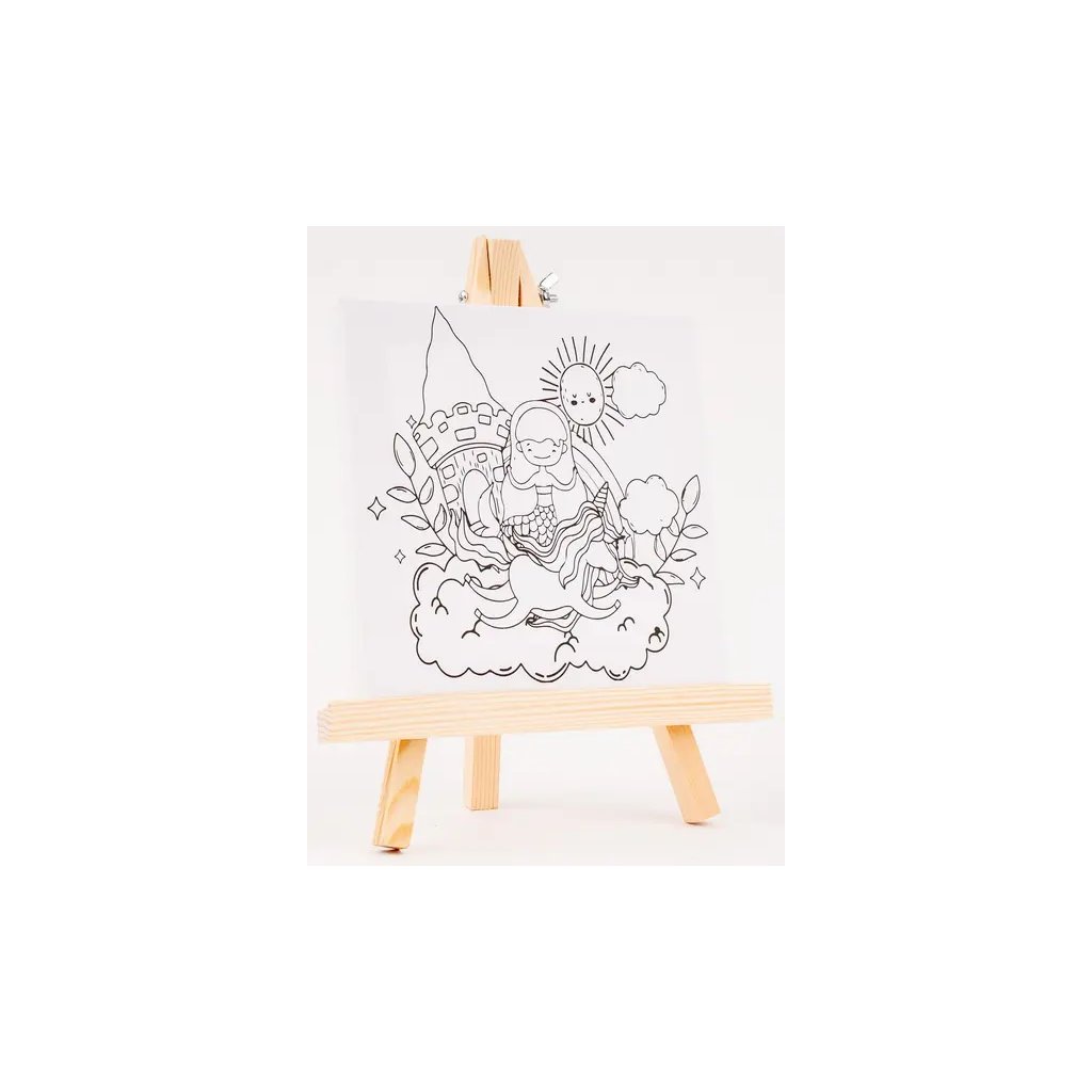Jedná se o malířské plátno s předtištěným obrázkem mořské panny, jednorožce a hradu, které je ideální pro začínající umělce a děti. V balení je také dřevěný stojan, na kterém si můžete hotové dílo vystavit. Plátno má jasně bílou barvu a rozměry 15 x 15 cm. Stojánek v motivu dřeva má rozměr 23 x 18 cm. Pro vymalování se dají použít různé techniky, jako jsou akvarelové fixy, akrylové barvy nebo barevné tužky.Doplňkové parametry
