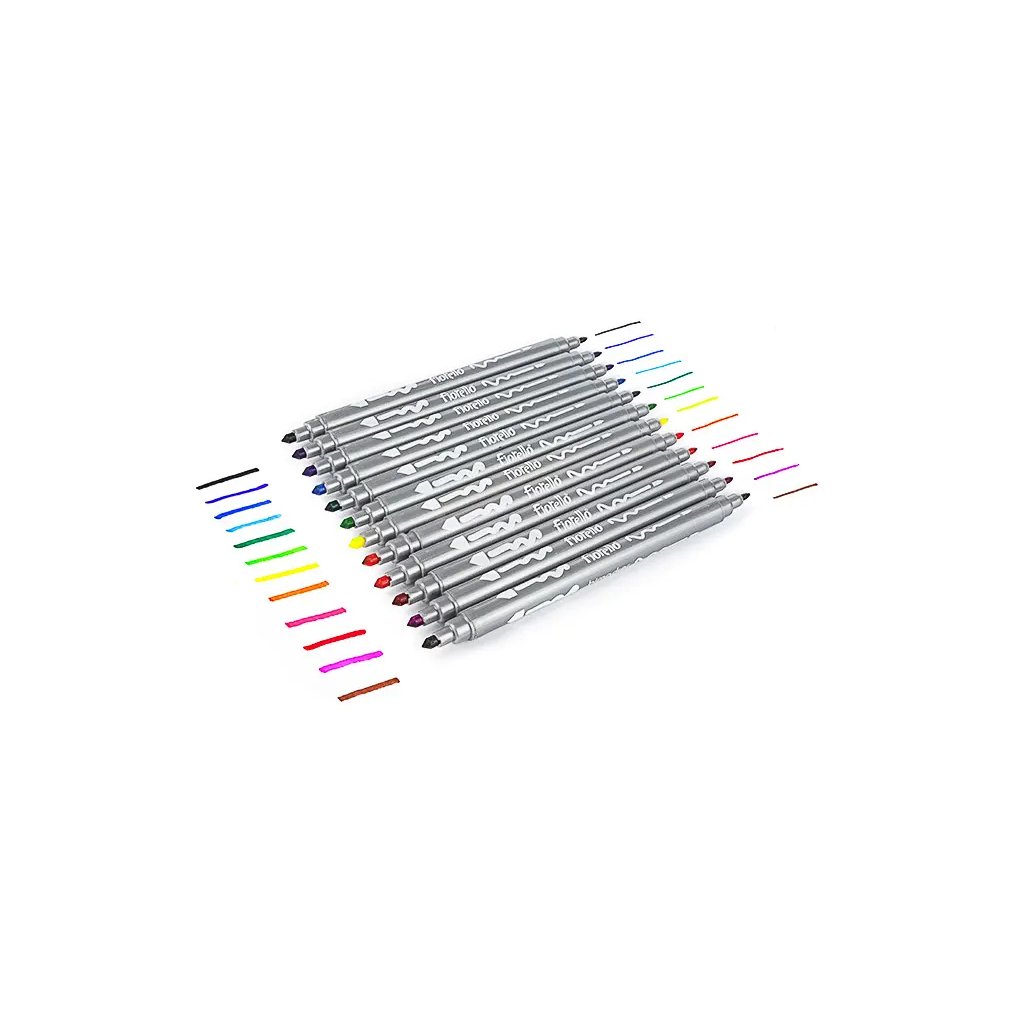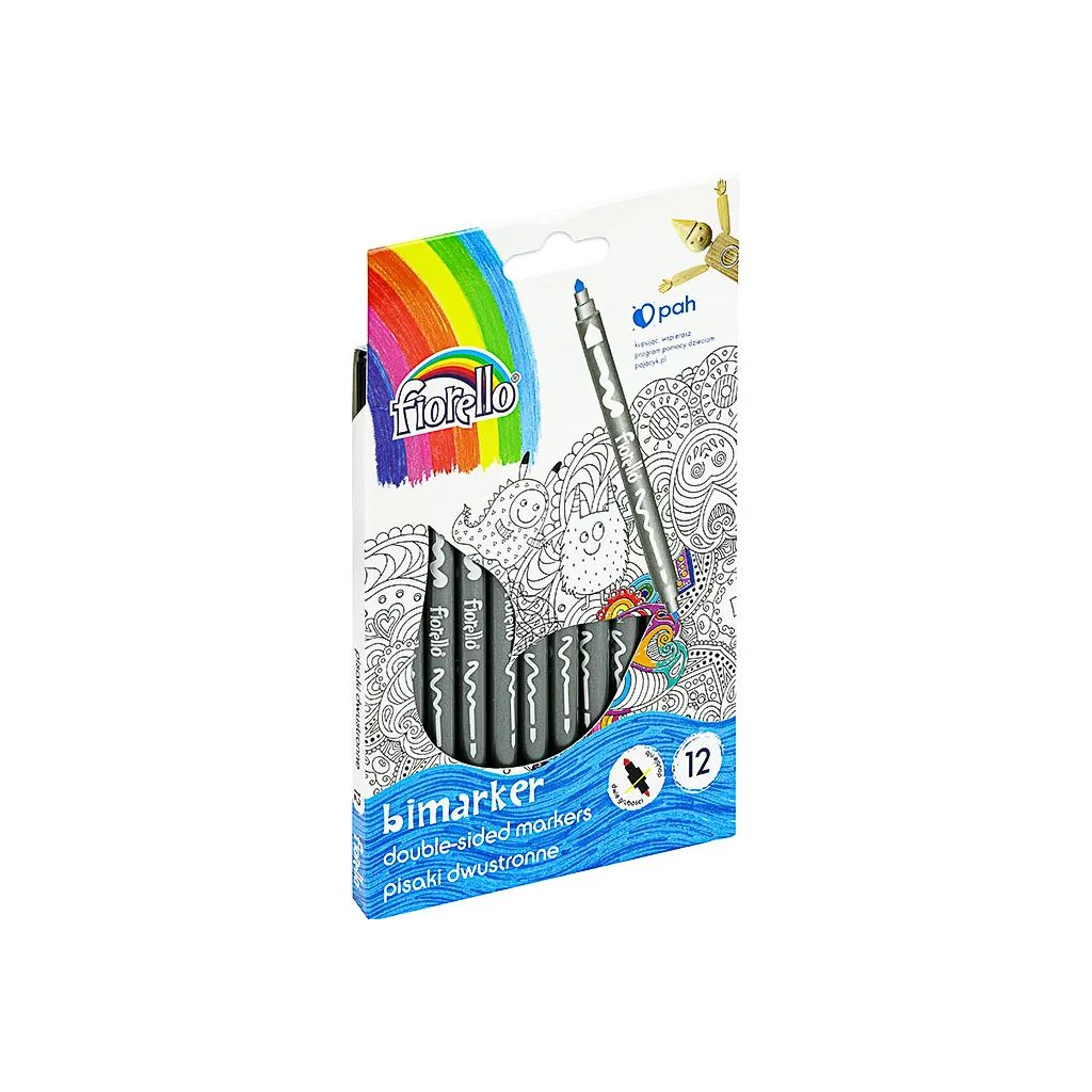 Jedná se o sadu 12 barevných oboustranných popisovačů Bimarker. Popisovače mají dva hroty – jeden tenký pro detailní kreslení a jeden hrubý pro vybarvování větších ploch. Jsou vypratelné, což je ideální pro dětské kreslení, protože se nemusíte bát skvrn na oblečení nebo jiných textiliích. Popisovače se dají použít na papír, omalovánky nebo plakáty.Doplňkové parametry