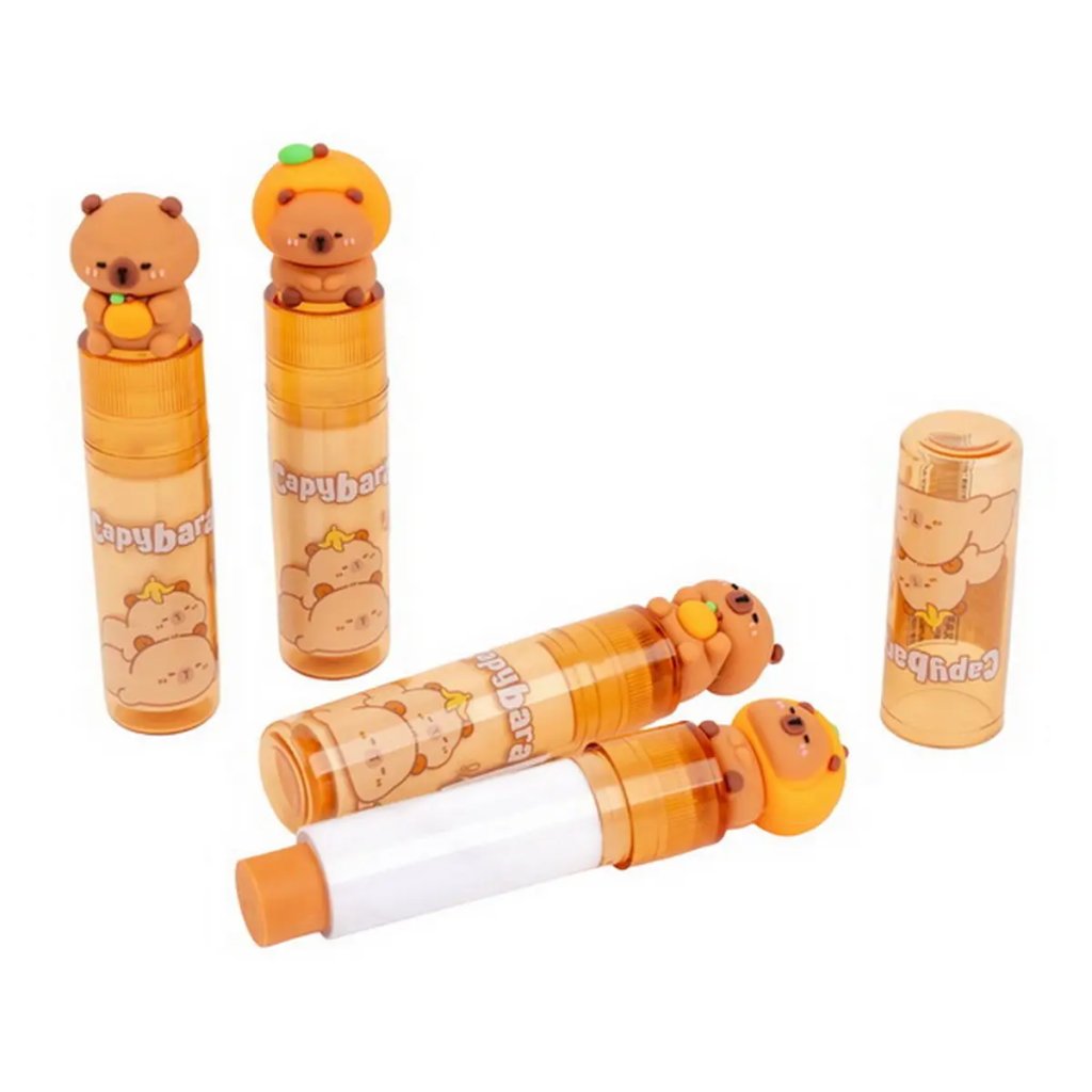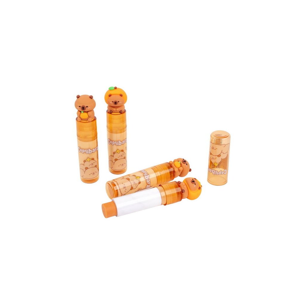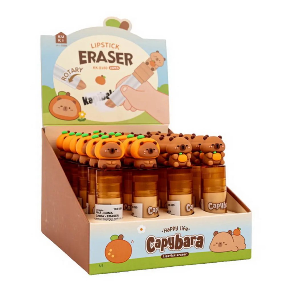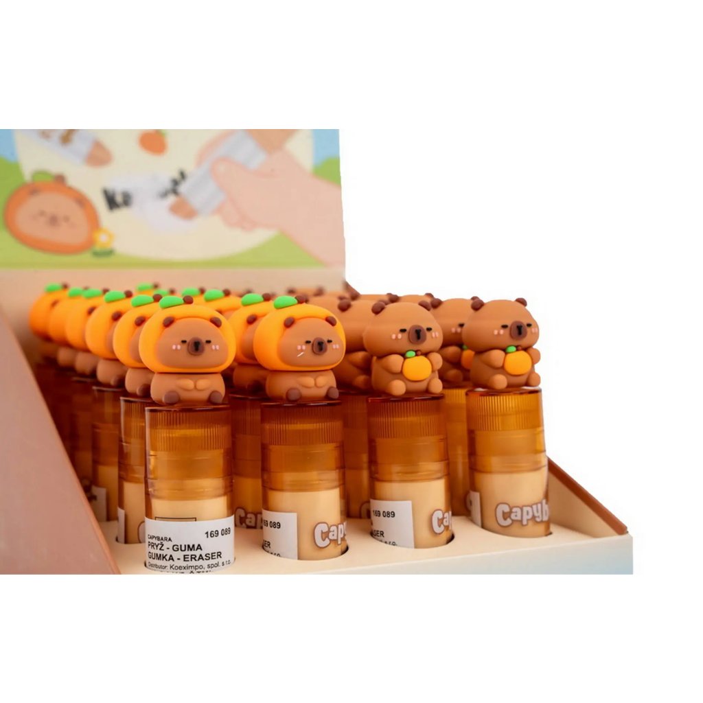 Jedná se o praktickou a hravou pryž (gumu) s motivem kapybary. Pryž má design ve tvaru rtěnky (vysouvacího aplikátoru). Pryž se vysunuje otáčením spodní části a zůstává vždy čistá. Je kompaktní s rozměry cca 9 x 2 cm. Je dodávána v mixu motivů a je ideální pro školáky.Doplňkové parametry