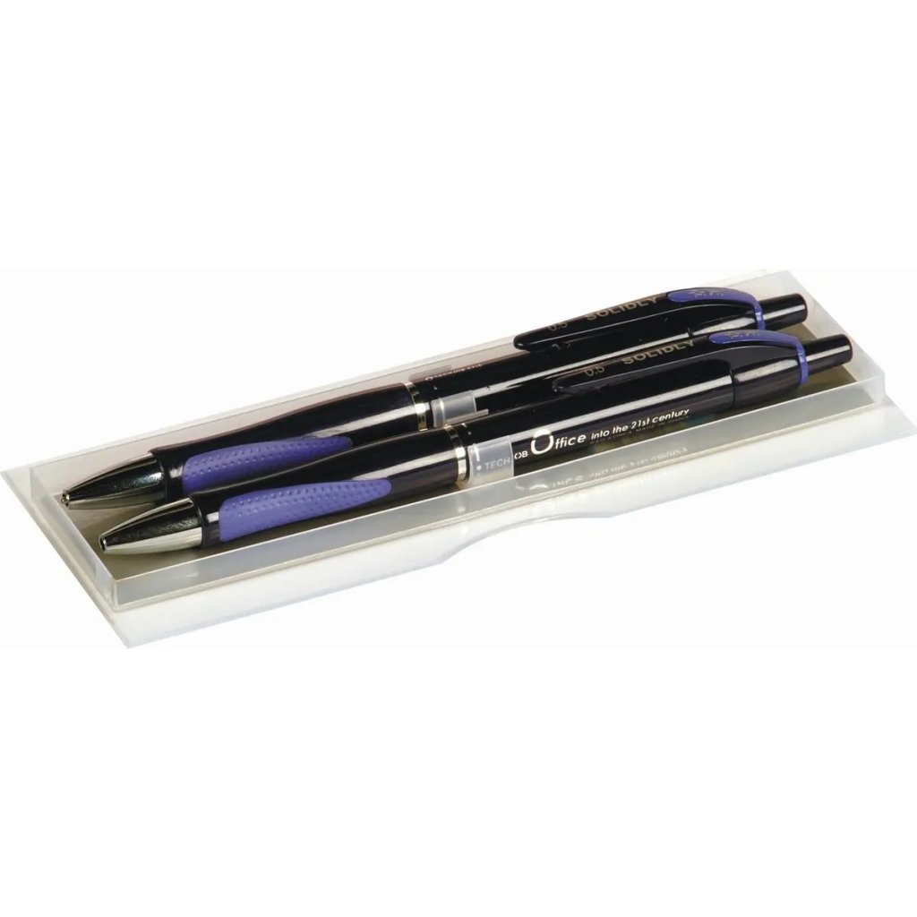 Tato dárková souprava Solidly je ideálním dárkem pro každého, kdo ocení moderní a praktické psací potřeby. Skládá se z plastového kuličkového pera a automatické tužky v elegantním modrém designu. Kuličkové pero má stiskací mechanismus, zasunovací hrot a jehlový hrot pro extra tenké psaní, píše modrým inkoustem o šířce stopy 0,5 mm. Automatická tužka je určena pro tuhy o průměru 0,5 mm. Obě psací potřeby mají gumovou úchopovou část pro pohodlné držení. Celý set je dodáván v dárkové krabičce, což z něj dělá perfektní dárek pro různé příležitosti.Doplňkové parametry