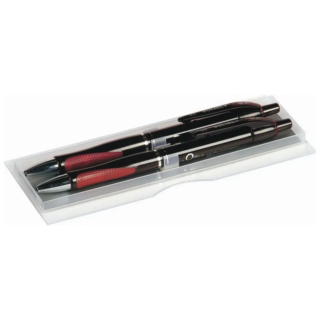 Tato dárková souprava Solidly je ideálním dárkem pro každého, kdo ocení moderní a praktické psací potřeby. Skládá se z plastového kuličkového pera a automatické tužky v elegantním vinovém designu. Kuličkové pero má stiskací mechanismus, zasunovací hrot a jehlový hrot pro extra tenké psaní, píše modrým inkoustem o šířce stopy 0,5 mm. Automatická tužka je určena pro tuhy o průměru 0,5 mm. Obě psací potřeby mají gumovou úchopovou část pro pohodlné držení. Celý set je dodáván v dárkové krabičce, což z něj dělá perfektní dárek pro různé příležitosti.Doplňkové parametry
