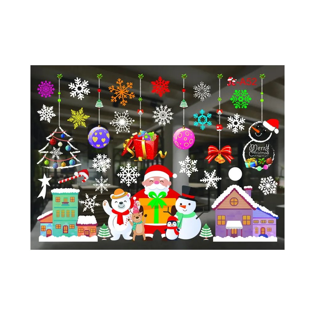 Jedná se o dekoraci na okna bez lepidla, která drží na hladkých plochách (okna, zrcadla, dveře) díky svým elektrostatickým vlastnostem. Ideální pro snadné a opakované sezónní zdobení. Set obsahuje 2 archy o velikosti 35 x 50 cm s několika jednotlivými samolepkami ve stylu veselé zimní vesničky a vánoční scény. Motivy v živých vánočních barvách zahrnují velkou centrální postavu Santa Clause s dárky, sněhuláka, polárního medvěda a roztomilého soba, doplněné různobarevnými vločkami, domky a závěsnými dekoracemi.Doplňkové parametry