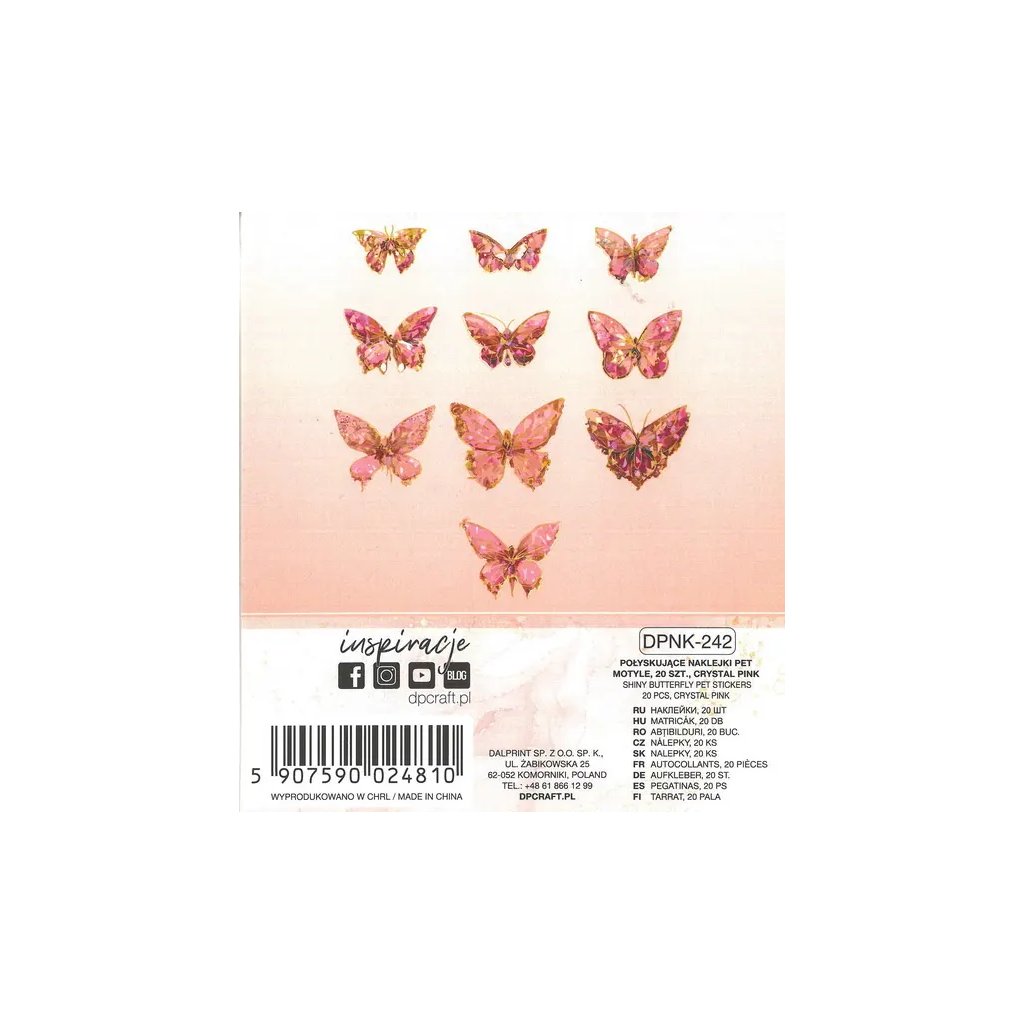 Jedná se o 20 kusů fóliových samolepek s motivem třpytivých motýlků v růžové barvě. Velikost jednotlivých samolepek se pohybuje od 5 do 7 cm. Jsou ideální pro dekoraci přáníček, dárků, deníků, fotoalb a pro různé kreativní projekty.Doplňkové parametry