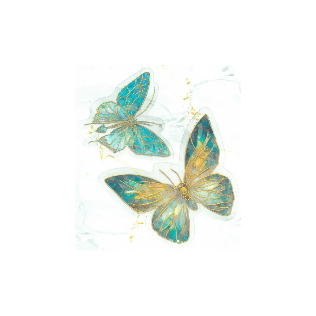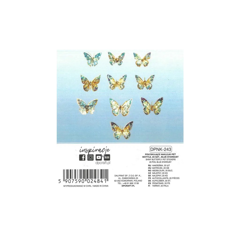 Jedná se o 20 kusů fóliových samolepek s motivem třpytivých motýlků v modré barvě. Velikost jednotlivých samolepek se pohybuje od 5 do 7 cm. Jsou ideální pro dekoraci přáníček, dárků, deníků, fotoalb a pro různé kreativní projekty.Doplňkové parametry