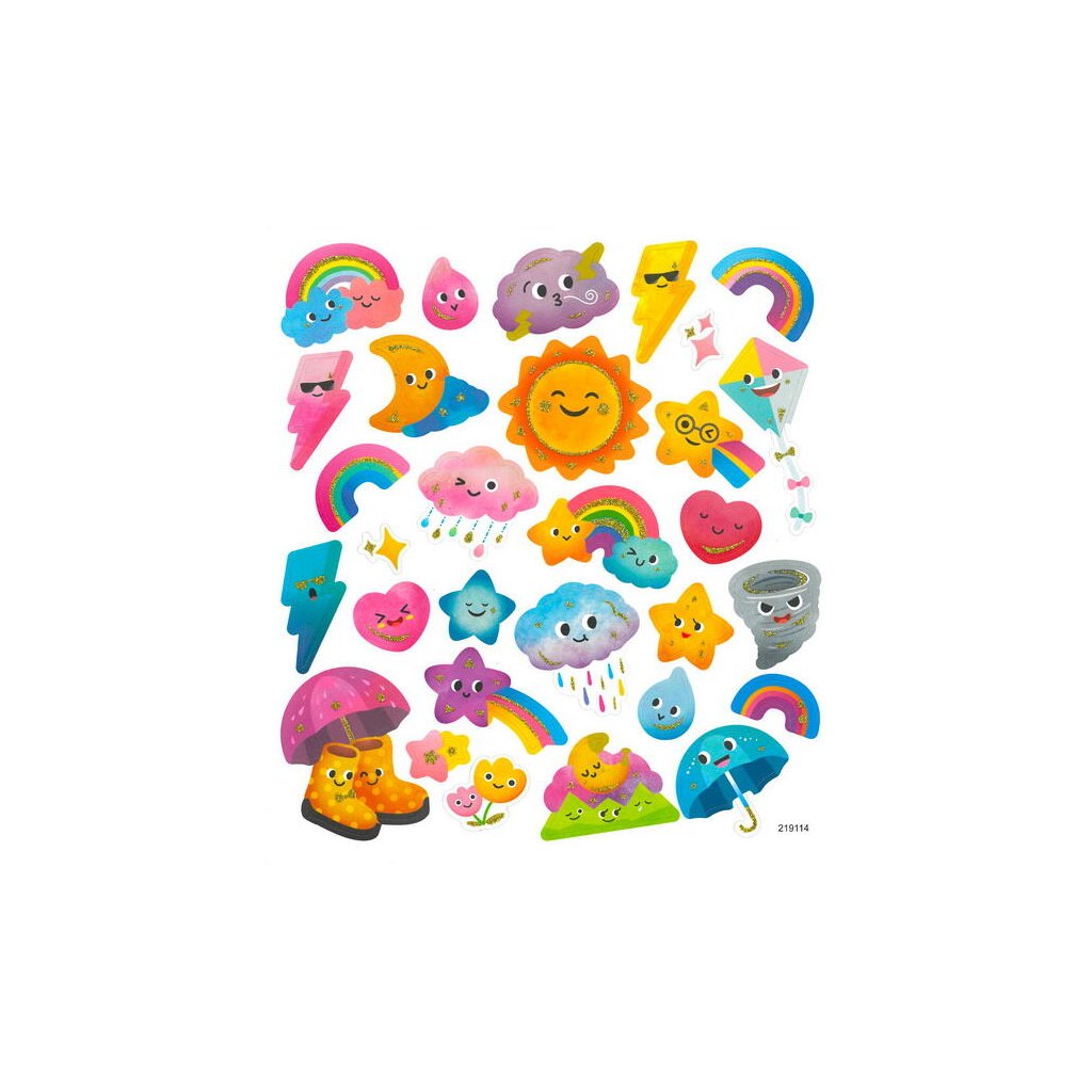 Papírové samolepky s motivem počasí a nebeských jevů jsou obsaženy v sadě 30 kusů. Mezi motivy najdeme sluníčka, mráčky, hvězdičky, duhy, blesky, měsíce, dešťové kapky, tornáda, ale i deštníky a holínky. Samolepky jsou umístěny na archu o rozměru 15 x 17 cm. Jsou ideální pro dekoraci přáníček, dárků, deníků, fotoalb, scrapbookingových projektů a dalších kreativních výtvorů.Doplňkové parametry