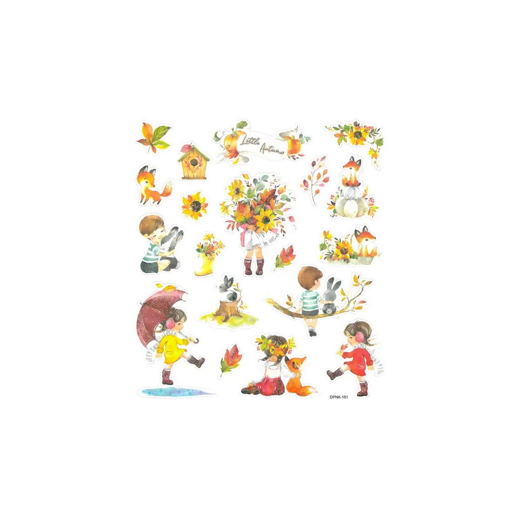 Papírové samolepky s motivem podzimu a dětí jsou obsaženy v sadě 19 kusů. Najdeme zde motivy dětí s deštníkem, s kyticí, s králíčkem, ale i lišky, slunečnice, ptáčci a listí. Velikost jednotlivých samolepek je přibližně 3 cm a jsou umístěny na archu o rozměru 15 x 17 cm. Jsou ideální pro dekoraci přáníček, dárků, deníků, fotoalb, scrapbookingových projektů a dalších kreativních výtvorů.Doplňkové parametry