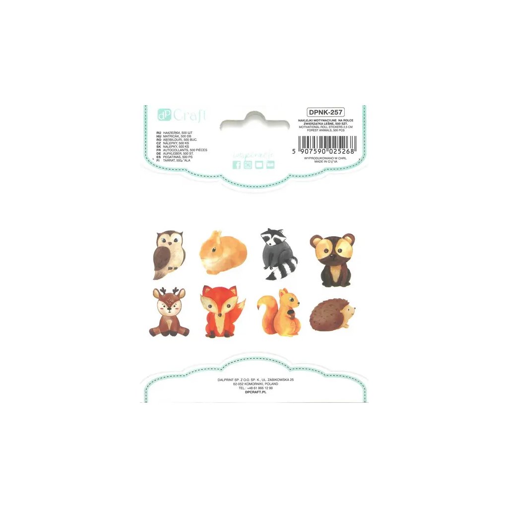 Papírové samolepky na rolce s motivem lesních zvířátek jsou obsaženy v balení 500 kusů, přičemž najdete 8 různých motivů. Mezi zvířátky jsou sova, křeček, mýval, medvěd, srnka, liška, veverka a ježek. Samolepky mají průměr 2,5 cm a jsou ideální pro dekoraci přáníček, dárků, deníků, fotoalb, scrapbookingových projektů a dalších kreativních výtvorů.Doplňkové parametry
