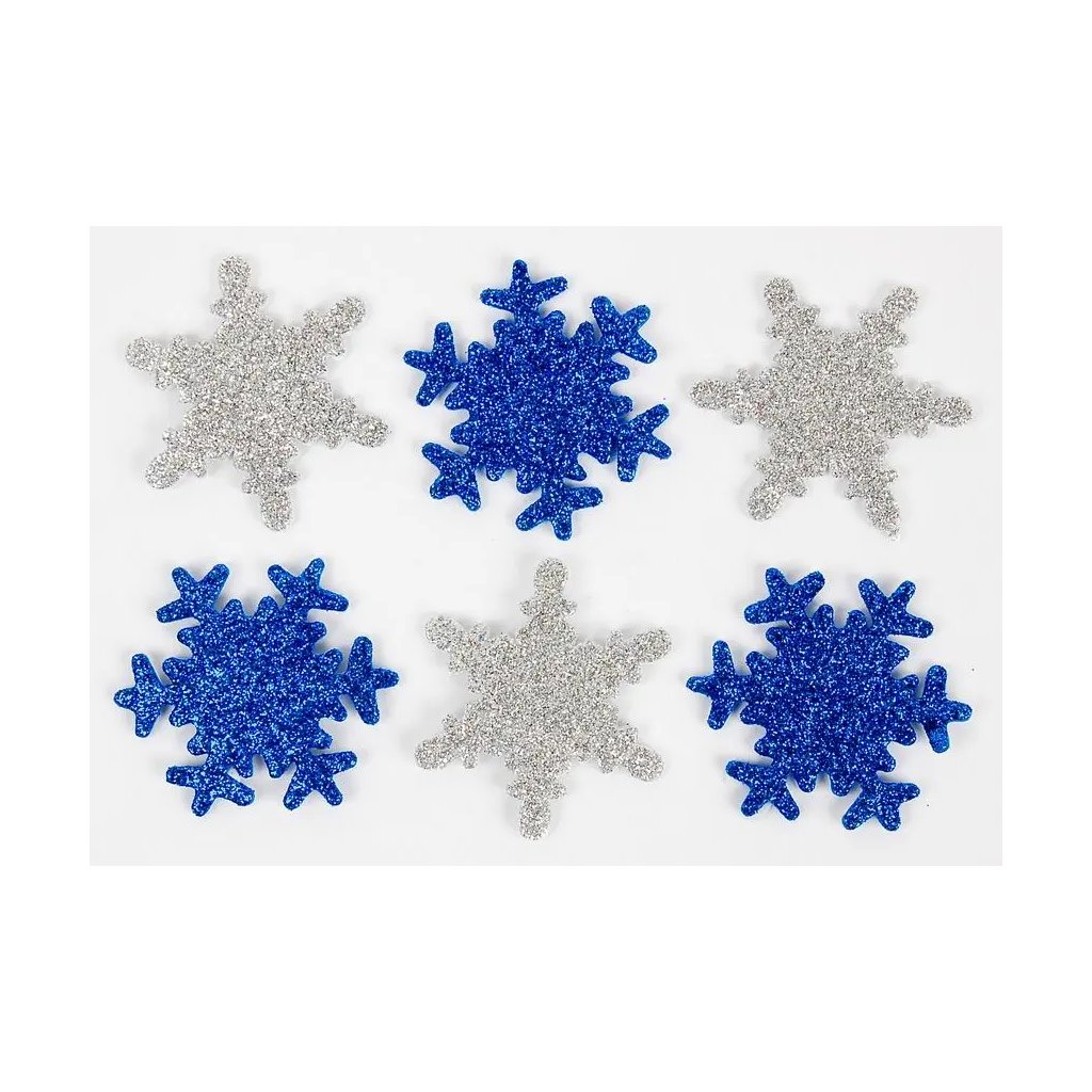 Pěnové samolepky s motivem sněhových vloček jsou obsaženy v balení 12 kusů. Najdeme zde vločky v modré a stříbrné barvě, které jsou zdobené třpytkami (glittery). Velikost jednotlivých samolepek je 5 cm, tloušťka je 2 mm. Tyto samolepky jsou ideální pro dekoraci přáníček, dárků, deníků, fotoalb, scrapbookingových projektů a dalších kreativních výtvorů.Doplňkové parametry