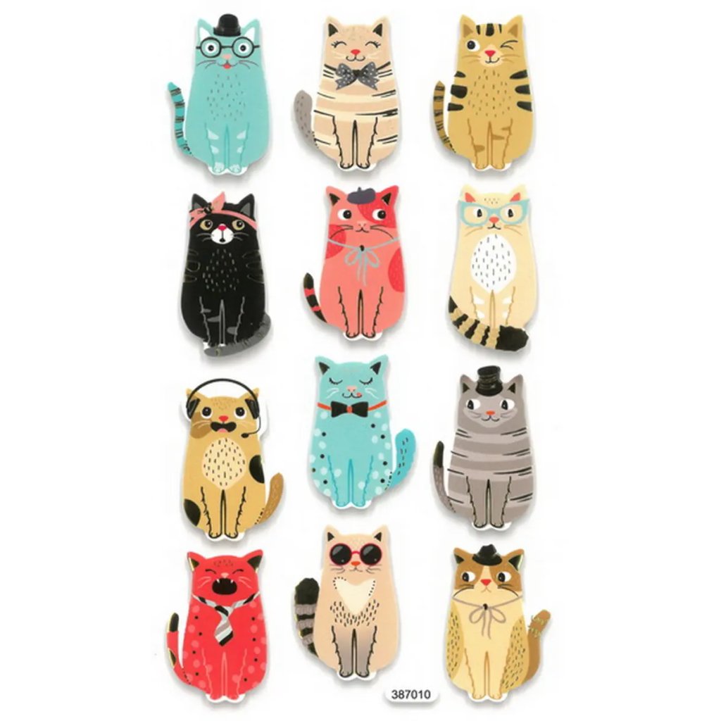 Pěnové samolepky s motivem koček jsou obsaženy v balení 12 kusů na archu o rozměru 10 x 16 cm. Najdeme zde kočky v různých barvách a s různými doplňky, jako jsou brýle, mašle nebo klobouky. Některé kočky mají zlaté doplňky. Velikost jednotlivých samolepek je přibližně 3 cm. Tyto samolepky jsou ideální pro dekoraci přáníček, dárků, deníků, fotoalb, scrapbookingových projektů a dalších kreativních výtvorů.Doplňkové parametry