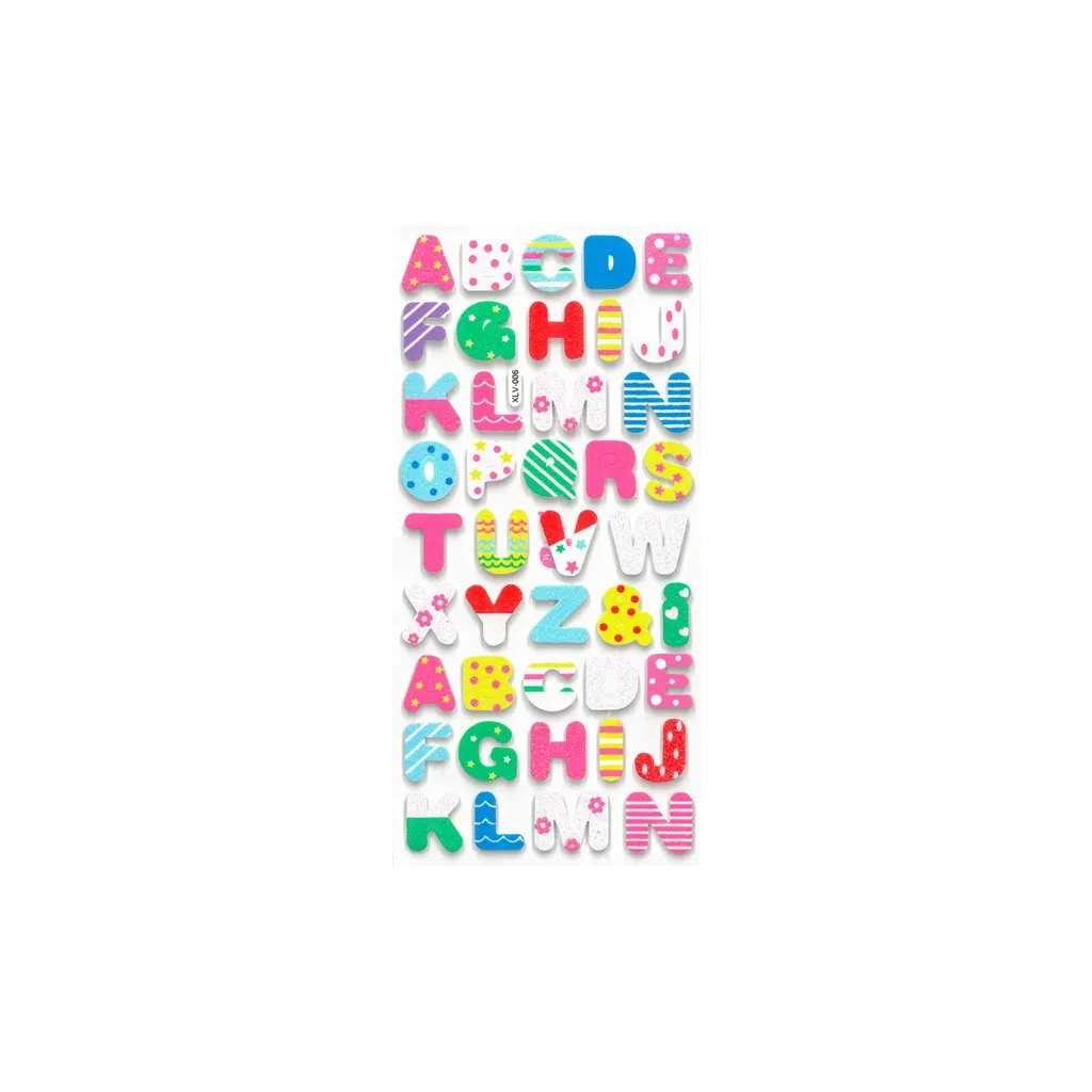 Pěnové třpytivé samolepky s motivem abecedy jsou obsaženy v balení 42 kusů. Na archu jsou písmenka A-Z v různých barvách a se vzory, jako jsou puntíky, proužky, květy a hvězdičky. Velikost jednotlivých samolepek je přibližně 3 cm, tloušťka je 2 mm. Tyto samolepky jsou ideální pro dekoraci dětských pokojů, přáníček, dárků, deníků, fotoalb, scrapbookingových projektů a dalších kreativních výtvorů.Doplňkové parametry