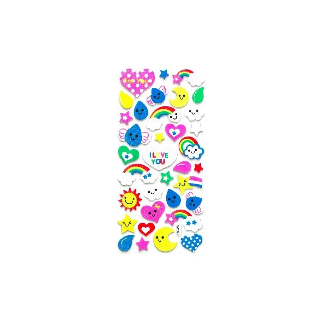 Pěnové třpytivé samolepky s motivem duhy jsou obsaženy v balení 35 kusů. Najdeme zde sluníčko, měsíc, hvězdičky, mráčky, srdíčka, kapky a duhy s roztomilými obličeji. Součástí je také samolepka s nápisem "I LOVE YOU". Velikost jednotlivých samolepek je přibližně 3 cm, tloušťka je 2 mm. Tyto samolepky jsou ideální pro dekoraci dětských pokojů, přáníček, dárků, deníků, fotoalb, scrapbookingových projektů a dalších kreativních výtvorů.Doplňkové parametry