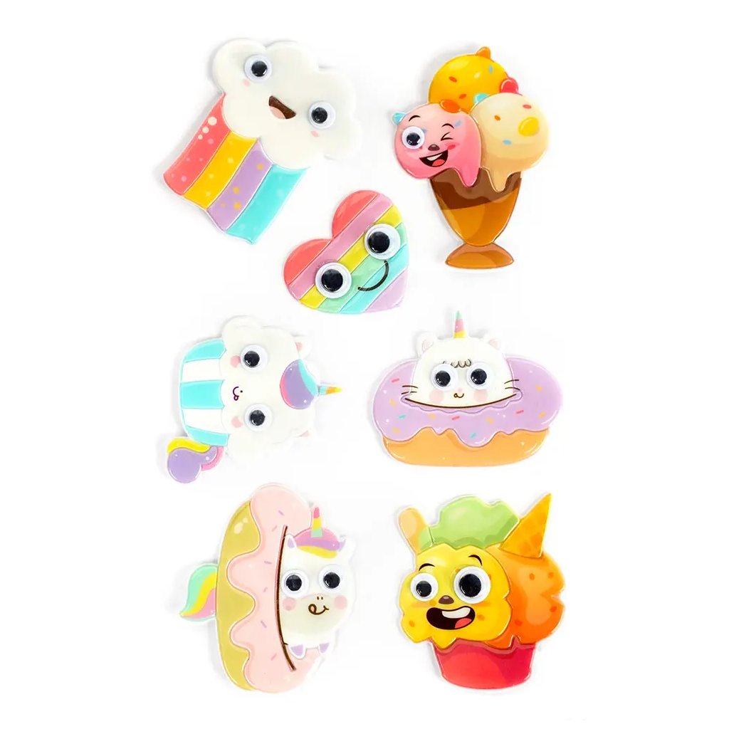 Plastové puffy samolepky s motivem sladkostí jsou obsaženy v balení 7 kusů na archu o rozměru 10 x 15,5 cm. Najdeme zde mix různých usměvavých a roztomilých sladkostí, jako jsou zmrzliny, kornoutky, dorty, koblihy a bonbóny. V motivu/dekoru dřeva je podstavec pod zmrzlinou. Tyto samolepky jsou ideální pro dekoraci dětských pokojů, přáníček, dárků, deníků, fotoalb, scrapbookingových projektů a dalších kreativních výtvorů.Doplňkové parametry