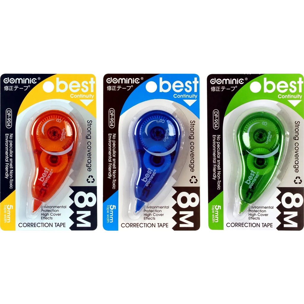 Tento korekční strojek Dominic je ideálním pomocníkem pro rychlé a přesné opravy v textu. Je bez chemických rozpouštědel a má silnou krycí schopnost. Páska má šířku 5 mm a délku 8 m, což zajišťuje dlouhotrvající použití.Doplňkové parametry