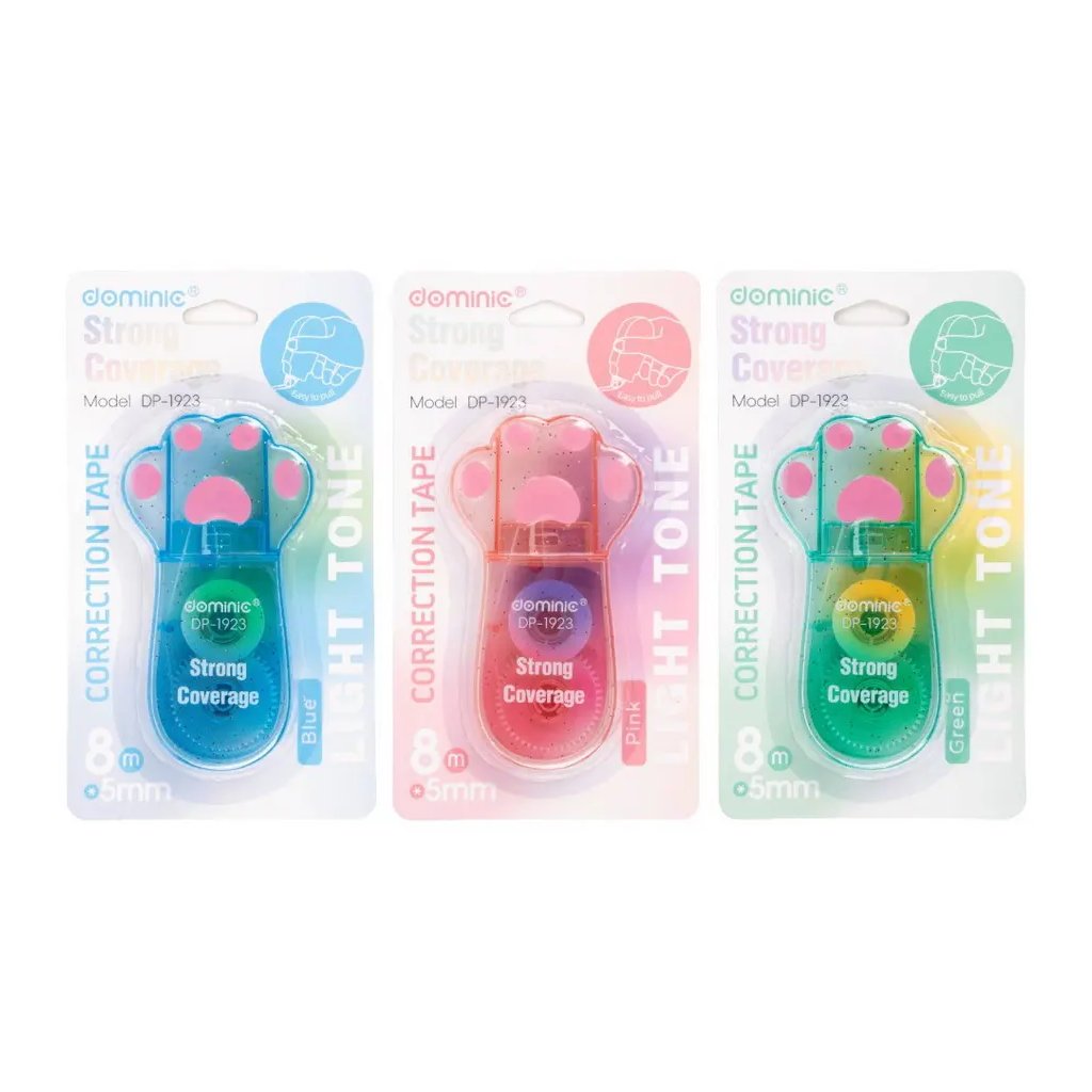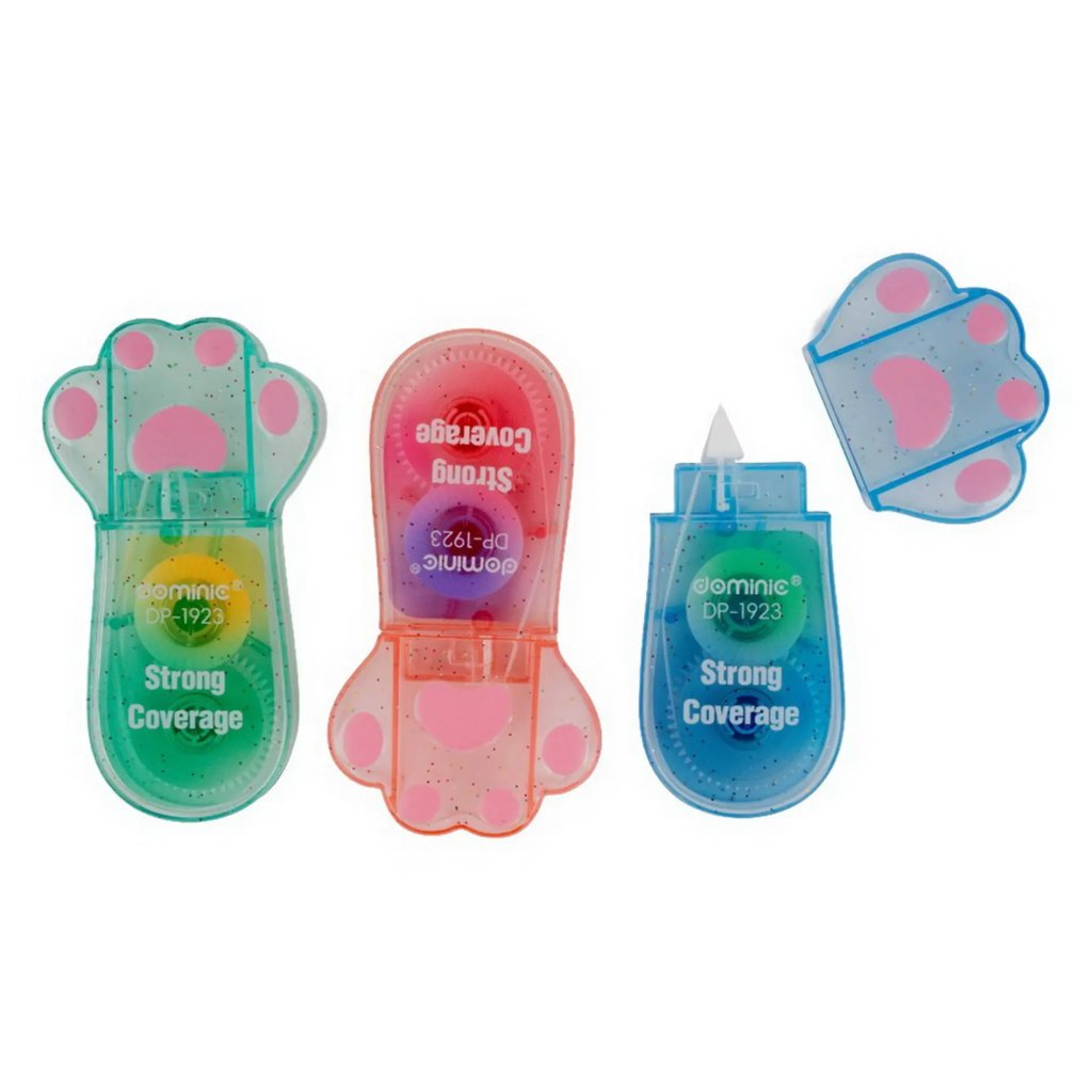 Jedná se o korekční strojek (roller) s veselým designem ve tvaru kočičí tlapky (Paw). Strojek obsahuje silně kryjící pásku o šířce 5 mm a délce 8 metrů. Páska zajišťuje rychlé a efektivní opravy. Strojek je navržen pro snadné použití a neobsahuje žádná chemická rozpouštědla. Je k dispozici v různých barevných provedeních se třpytivým efektem (např. tyrkysová, růžová, modrá).Doplňkové parametry