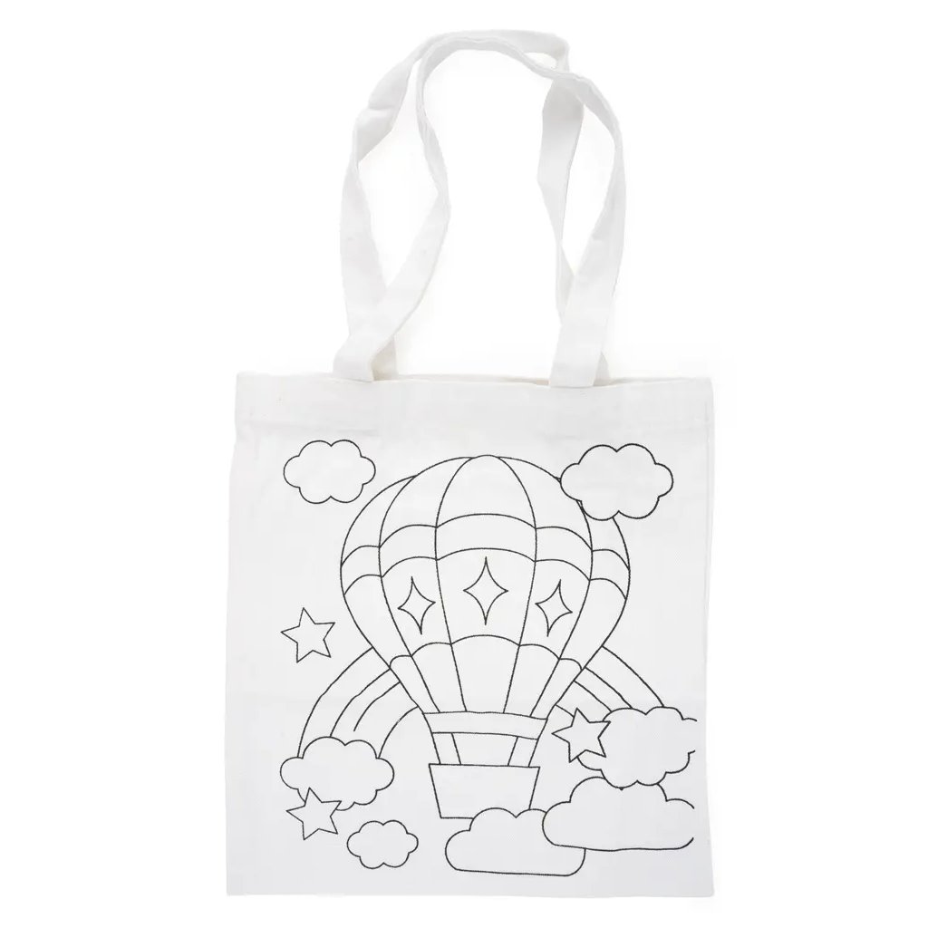 Jedná se o plátěnou tašku v bílé barvě s předlohou pro vymalování. Taška má rozměry 27 x 29 cm a je ideální pro kreativní tvoření. Na tašce je předloha s motivem horkovzdušného balónu, duhy, obláčků a hvězdiček. Tašku lze vybarvit různými technikami, jako jsou textilní fixy nebo barvy na textil. Při vybarvování libovolnou technikou doporučujeme vložit dovnitř tašky hrubší papír nebo třeba noviny, aby barva neprosákla na druhou stranu tašky.Doplňkové parametry