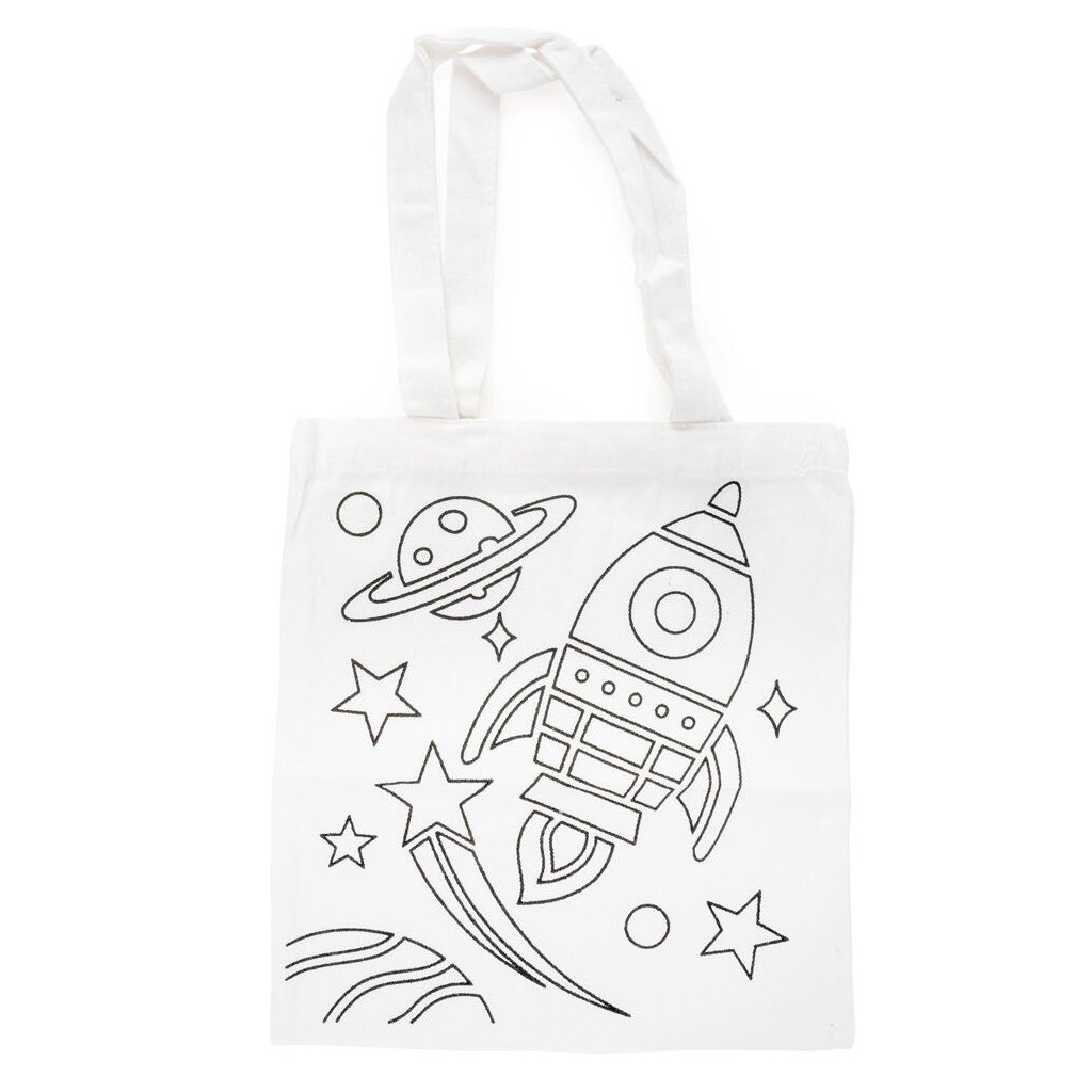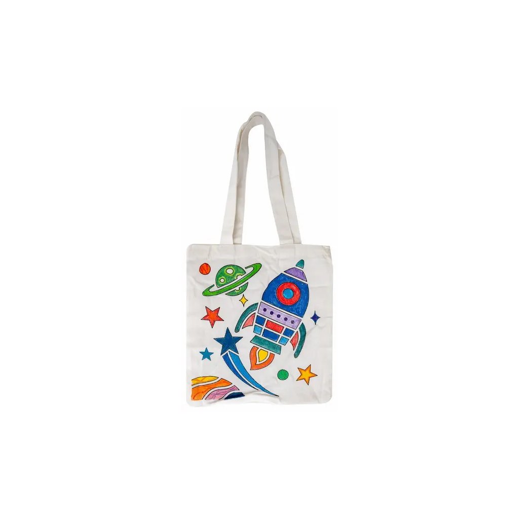 Jedná se o plátěnou tašku v bílé barvě s předlohou pro vymalování. Taška má rozměry 27 x 29 cm a je ideální pro kreativní tvoření. Na tašce je předloha s motivem vesmíru, kde nechybí raketa, planety, hvězdy a stopy po letu. Tašku lze vybarvit různými technikami, jako jsou textilní fixy nebo barvy na textil. Při vybarvování libovolnou technikou doporučujeme vložit dovnitř tašky hrubší papír nebo třeba noviny, aby barva neprosákla na druhou stranu tašky.Doplňkové parametry