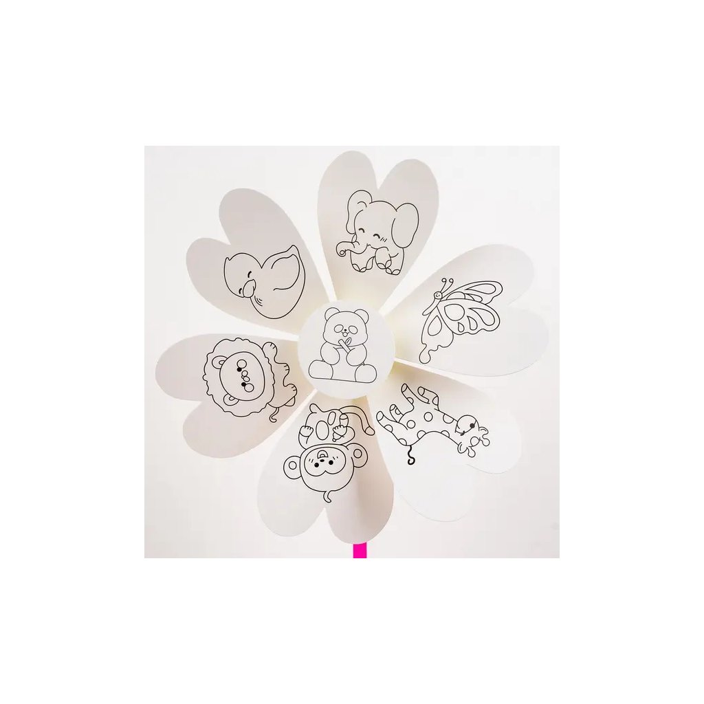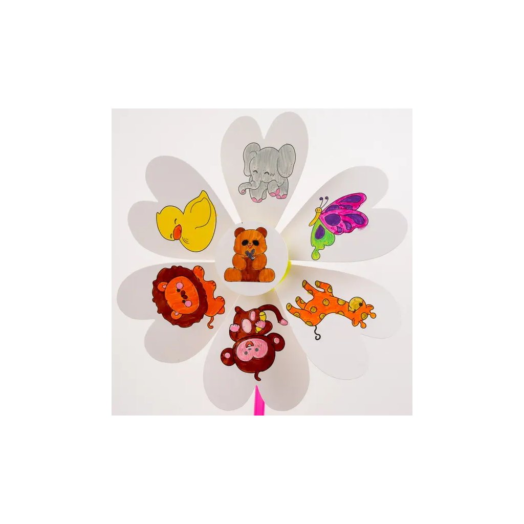 Jedná se o papírový větrník s předlohou pro vymalování s motivem safari zvířátek, který je ideální k dekoraci. Větrník se skládá ze 6 cípů, středového kolečka a tyčky. Celková délka složeného větrníku je 38,5 cm. Děti si mohou větrník vybarvit dle vlastní fantazie a poté ho složit. Motivy k vymalování zahrnují slona, lva, opici, žirafu, kachnu a motýla.Buďte první, kdo napíše příspěvek k této položce.