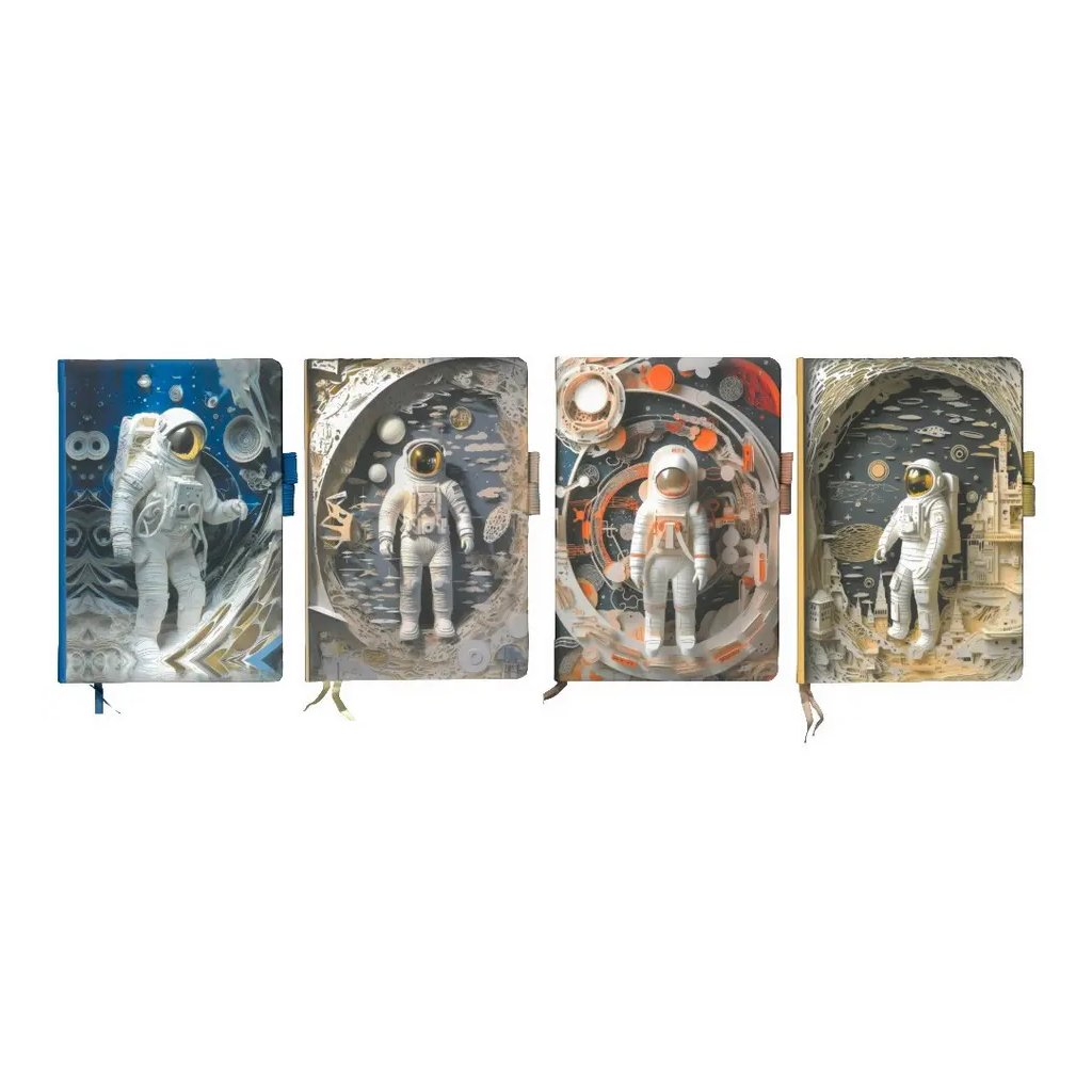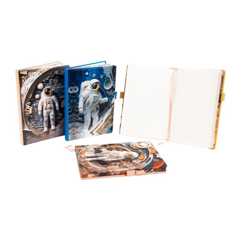 Jedná se o atraktivní zápisník formátu A5 (cca 14,5 x 21 cm) s designovými obálkami s motivem vesmíru a astronautů. Zápisník obsahuje 80 listů linkovaného papíru, je ideální pro školu, práci, deník nebo poznámky. Praktická gumička na boku slouží k zajištění zápisníku nebo pro uchycení pera. Zápisník je dostupný v mixu vzorů a barev s moderními 3D/kolážovými motivy. Jelikož se jedná o mix motivů, pokud Vám záleží na konkrétním designu obálky (např. modrý, červený), specifikujte jej, prosím, co nejpřesněji v poznámce k objednávce.Doplňkové parametry