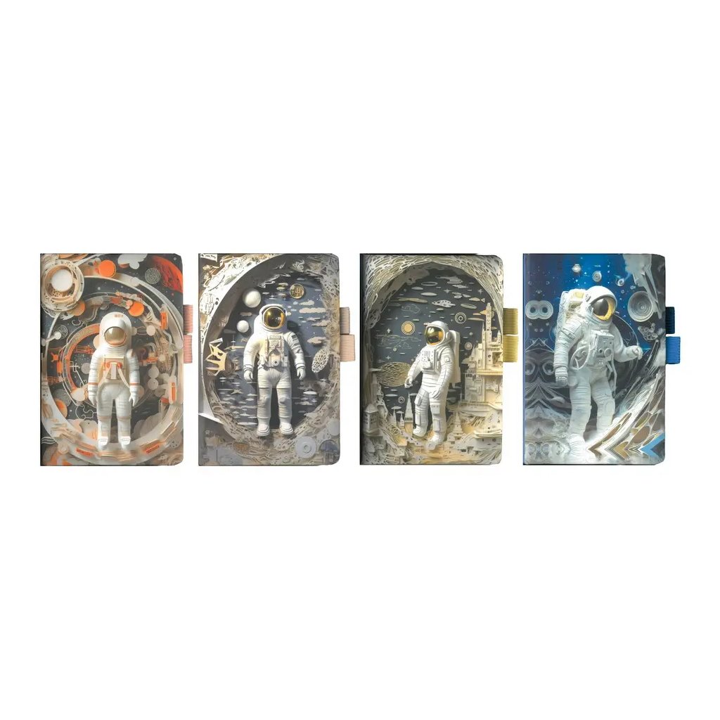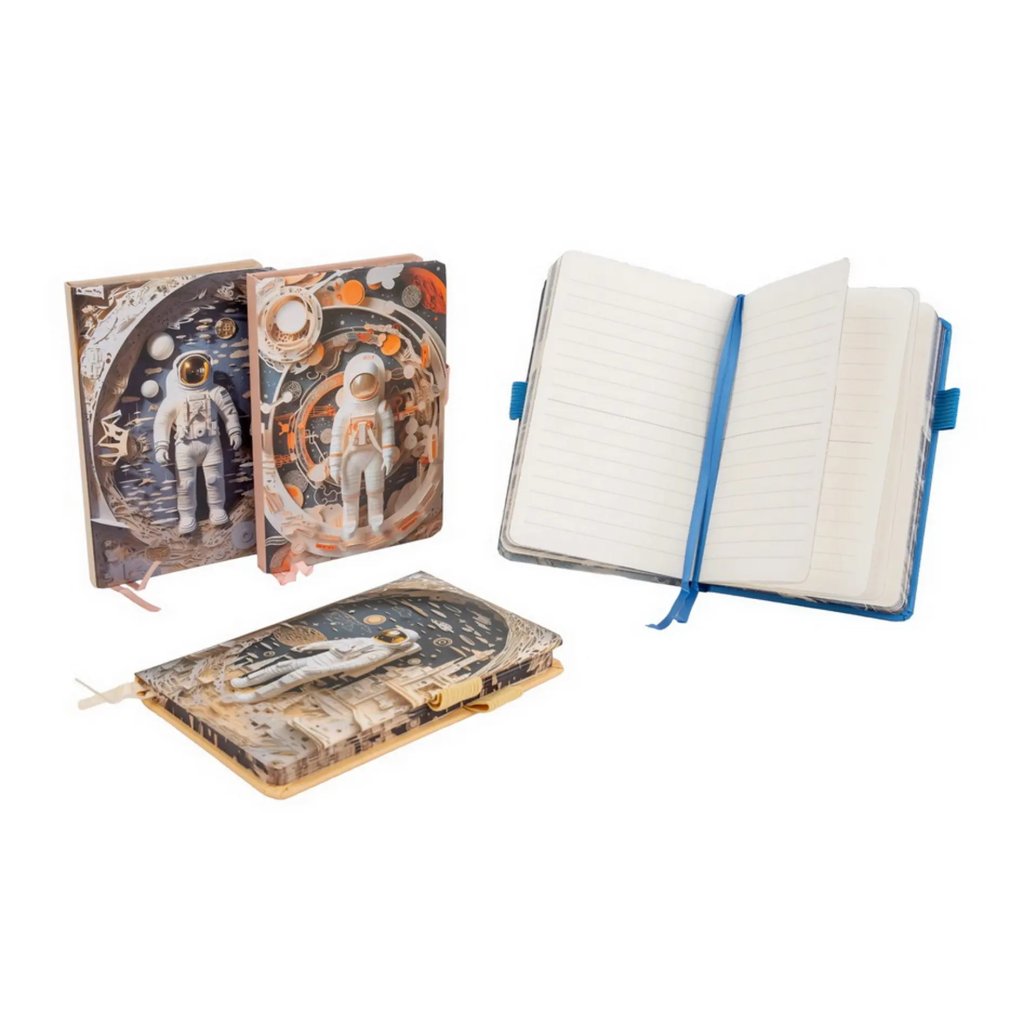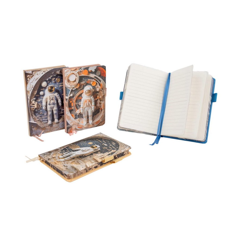 Jedná se o stylový linkovaný zápisník ve formátu cca C6 s atraktivními motivy kosmonautů, raket, a vesmírných scén. Zápisník má rozměr 11 x 16 cm a obsahuje 80 listů. Papír uvnitř je linkovaný pro přehledné psaní. Disponuje praktickou gumičkou na pero a zavíráním. Vzhledem k mixu vzorů je motiv dodáván dle aktuální skladové dostupnosti. Pokud byste chtěli konkrétní motiv, uveďte jej, prosím, v poznámce objednávky. Pokusíme se vaše přání splnit.Doplňkové parametry