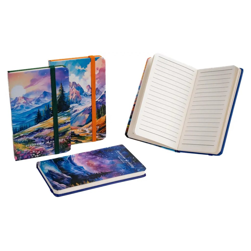 Jedná se o linkovaný zápisník s gumičkou, který má na obálce atraktivní motiv hor. Zápisník o rozměrech 8,5 x 14 cm obsahuje 80 listů. Je k dispozici v mixu vzorů v barvách: zelená, žlutá, modrá a fialová. Pokud je pro zákazníka důležitý konkrétní motiv, je potřeba ho specifikovat v poznámkách k objednávce.Doplňkové parametry