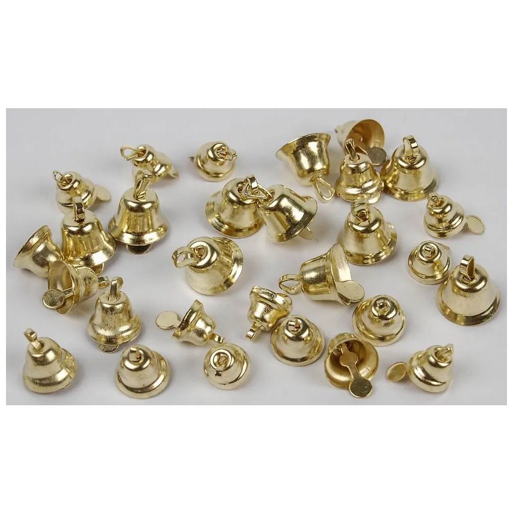 Jedná se o balení 30 kusů lesklých zlatých kovových zvonečků. Každý zvoneček má průměr 6 až 10 mm a je opatřen ouškem pro snadné navlečení. Jsou ideální pro kreativní a dekorativní projekty, jako je výroba šperků, ozdob na stromeček, vánočních dekorací nebo pro dozdobení dárků. Po zatřesení vydávají jemný, příjemný zvuk.Doplňkové parametry